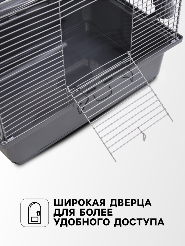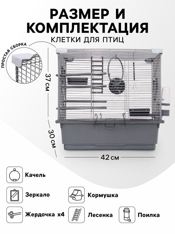 Габариты: 44 x 32 x 14; Цвет: Серый; Конструктивные особенности: С лесенкой, С зеркалом, С кормушкой, С поилкой, С жёрдочкой, Съёмная подстилка; Ручка на крыше: Да; Страна: Россия; В боксе: 1 шт; Фасовка: по 1 шт; Индивидуальная упаковка: Картонная коробка; Сертификат: Не подлежит сертификации; Форма: Прямоугольная; Длина, см: 42; Ширина, см: 30; Высота, см: 37; Расстояние между прутьями, мм: 11; С оборудованием: Да