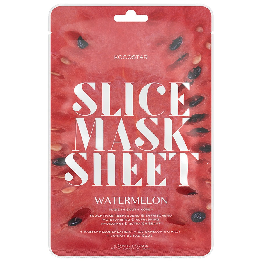 До свидания, расточка ухода за кожей рутины - привет, Корейские красоты Движению! Aussergewohnliche «Кусочек маска Лист» серия корейской красоты этикетки Kocostar сочетает в себе инновационный уход с натуральными ингредиентами и вызывает то же время с улыбкой на лице! Каждый пакет содержит два листа, каждый с шестью getrankten в сыворотке масок, которые могут быть применены индивидуально для лица, шеи, рук или ног - где-нибудь, где они необходимы. Mask Sheet Арбуз фрагмент делает свое название: отдельные маски в форме дыни дольки не только выделяющийся фрукты, но также разрешить определенный и очень отдельное приложение. Обогащенный с экстрактом арбуза сыворотки увлажняет кожу увлажненной и работает чудесно освежает.