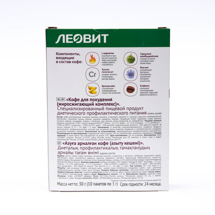 Производитель: Леовит; Габариты: 2,8 x 10 x 13,5; Доставка: Платная; Страна: Россия; В боксе: 30 набор; В наборе: 10 набор; Состав: См. на упаковке; Материалы: см. на упаковке; Фасовка: по 1 набор; Индивидуальная упаковка: Цветная картонная коробка; Сертификат: ЕАС; Вес нетто, г: 30; Вкус: Кофе; Вид кофе: Кофейный напиток; Форма выпуска: Порошок; Действующие вещества: Кофеин, Инулин; Микроэлементы: Cr (хром); Показания: Избыточный вес; Компоненты: L-карнитин; Действие: Похудение, Детоксикация Кофе уже давно стал одним из самых популярных напитков, который бодрит и поднимает настроение. Кофейные зерна обеспечивают ему тот самый глубокий аромат, перед которым многие не могут устоять. И в этом они совершенно правы. Мы приготовили для вас свой особый кофе. Тщательно отобранный кофе придает ему мягкий изысканный аромат, которым вы сможете наслаждаться каждое утро. Кроме того, мы сделали такой напиток полезным для похудения. Для этого мы добавили в него активные компоненты, способствующие регуляции жирового обмена, и пряности, которые усиливают их действие и к тому же прекрасно дополняют вкус кофе. Особенности: * регуляции жирового обмена (L-карнитин, хрома пиколинат, инулин); * снижению массы тела (L-карнитин, гарциния камбоджийская); * контролю аппетита (гарциния камбоджийская, хрома пиколинат). Состав: экстракт гарцинии камбоджийской, бромелайн, куркума, инулин, l-карнитин, витамин С, пиколинат хрома. Назначение: в качестве специализированного пищевого продукта диетического профилактического питания для снижения риска развития ожирения и метаболического синдрома, ускорения жирового обмена. Противопоказания: индивидуальная непереносимость компонентов. Применение: содержимое пакета (3 г) высыпать в чашку, развести горячей (но не кипящей) водой (100-150 мл) до желаемой крепости напитка. По вкусу можно добавить заменитель сахара. Принимать 2-3 раза в день. Использовать сразу после вскрытия пакета. Хранение: в сухом месте при температуре не выше 25 °C .