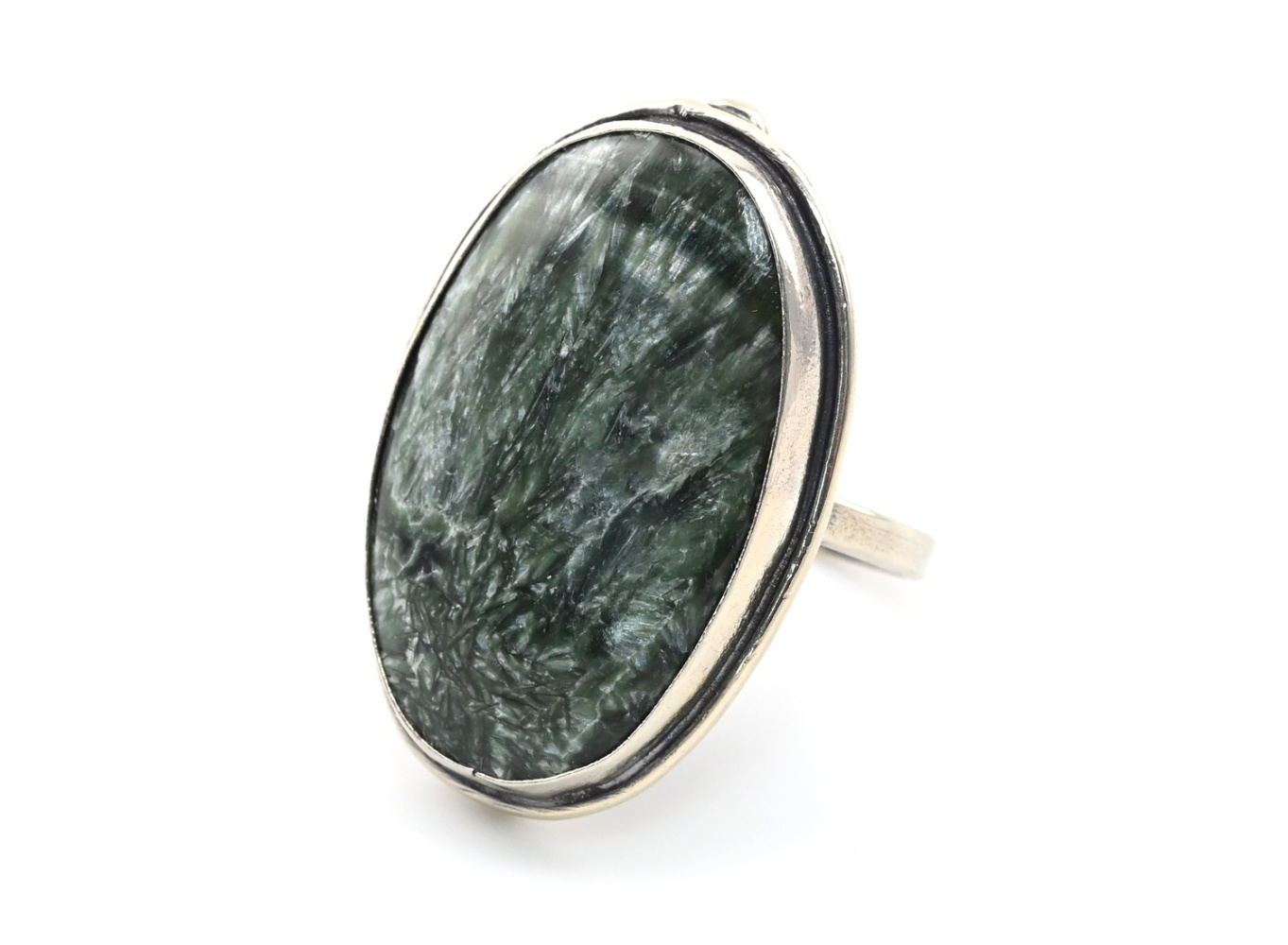 Материал: Серафинит; Натуральность: Натуральный камень; Месторождение: Россия; Основание: Нейзильбер; Размер кольца: 18
