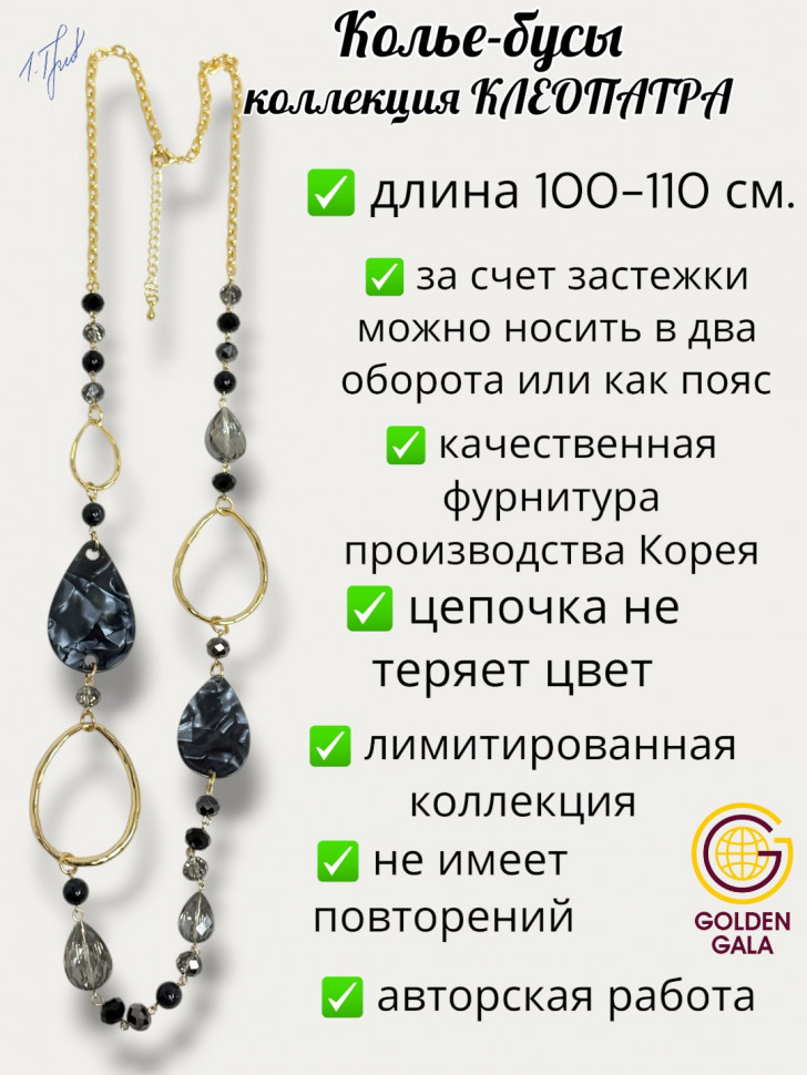 Колье длинное имеет размер 100-110 см. , и замок в виде «карабин», поэтому их можно надеть в два ряда и носить как объемное многослойное украшение.