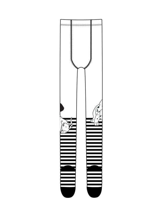 Детские колготки для девочки. Модель с милыми рисунками щенков-далматинцев, выполненные в черно-белой полоске. Колготки тянутся, хорошо сидят за счёт эластичного пояса, имеют удобную посадку и усиленный мысок и пятку. Материал — мягкий хлопковый трикотаж.