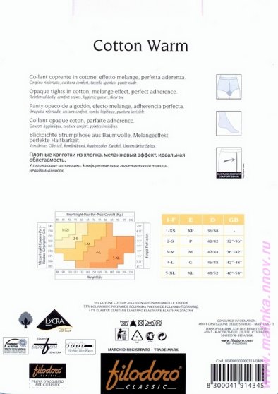 Производитель: Filodoro classic Оптовая продажа. Плотные колготки из хлопка, с шортиками, меланжевый эффект и эффект 3D; уплотненный мысок, х/б ластовица. Состав: Плотность: не указано Лайкра: 11% Полиамид: 33% Хлопок: 56%