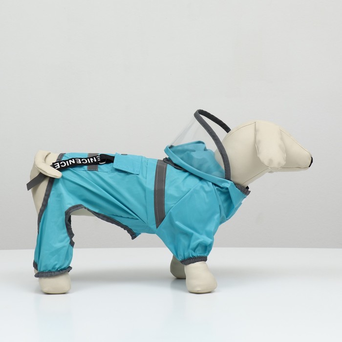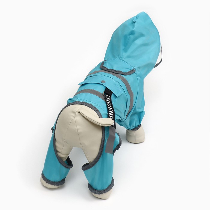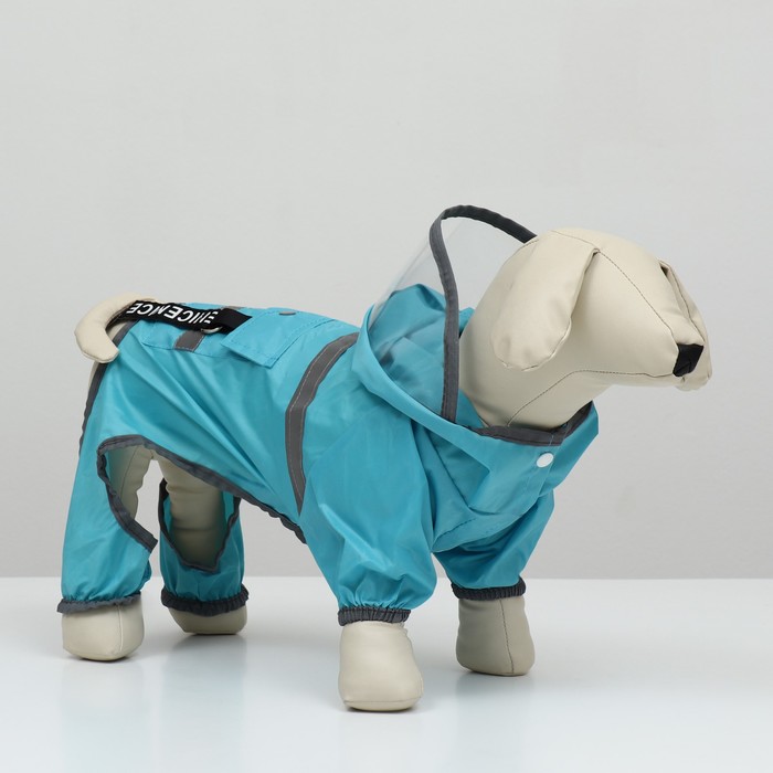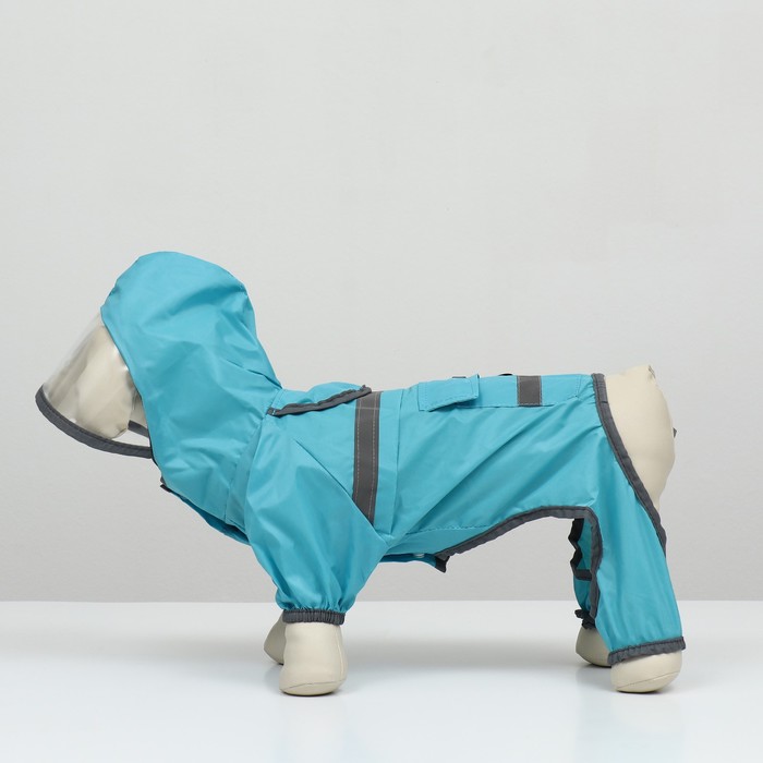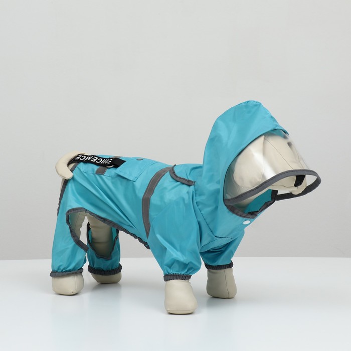 Комбинезон застегивается на кнопки, на лапах есть утягивающие резиночки, а на капюшоне есть прозрачный козырек, который защитит вашего питомца от ветра, пыли и дождя.