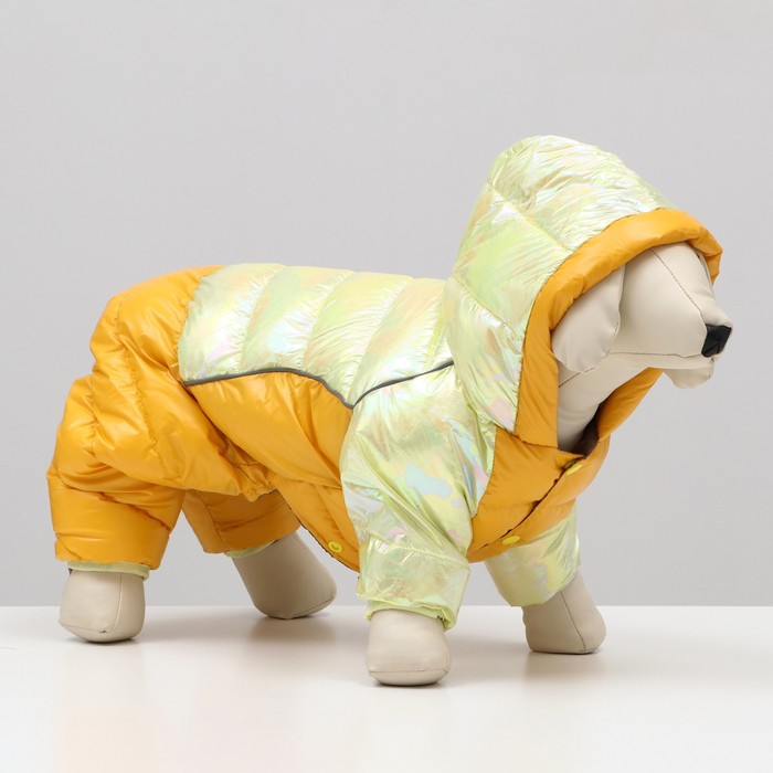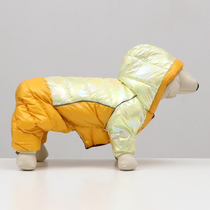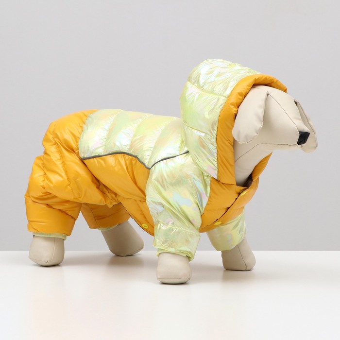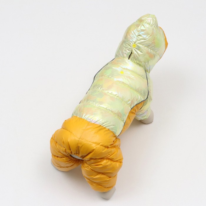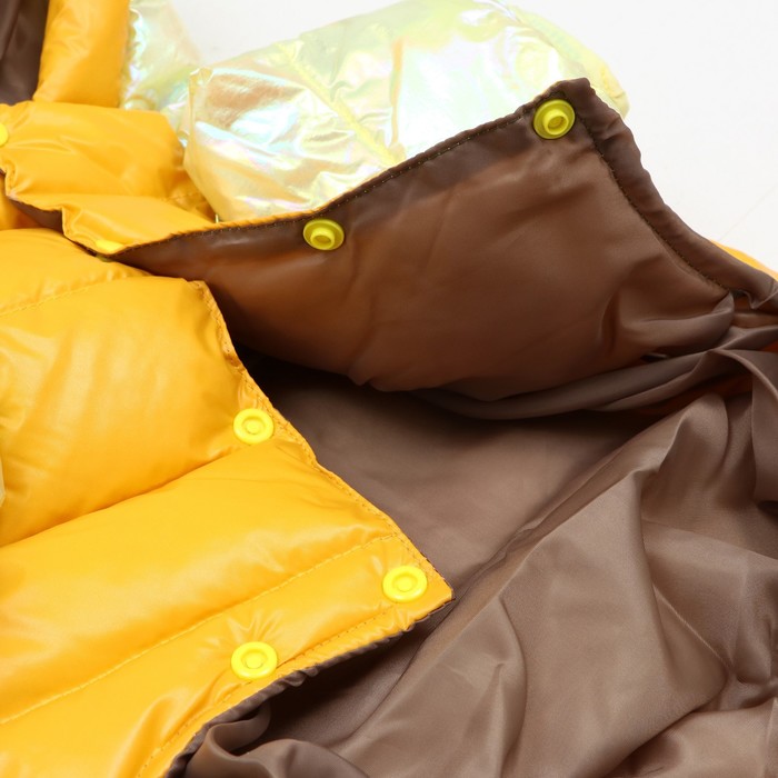 Габариты: 23 x 20 x 5; Страна: Китай; В боксе: 40 шт; Состав: Текстиль; Материалы: текстиль; Фасовка: по 1 шт; Индивидуальная упаковка: Пакет; Сертификат: ЕАС; Цвет: Жёлтый; Сезон: Зима; Вид застёжки: Кнопка; Длина спинки, см: 28; Обхват шеи, см: 27; Обхват груди, см: 38; Пол: Самец, Самка; С подкладкой: Да; Вид застёжки: Кнопка Комбинезон из водоотталкивающей и ветрозащитной ткани с застежками на кнопках снизу идеален для прогулок в холодную, морозную, сырую погоду и защитит вашу собаку от холода, снега и грязи. Подходит для мальчиков и девочек. Комбинезонс плотным синтепоновым подкладом. Интересный дизайн и необычные цвета выделят вашего любимца и сделают ваши прогулки комфортнее. Сезон весна - осень - зима.