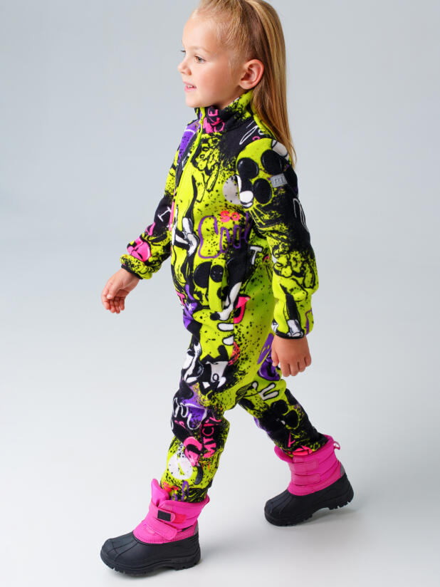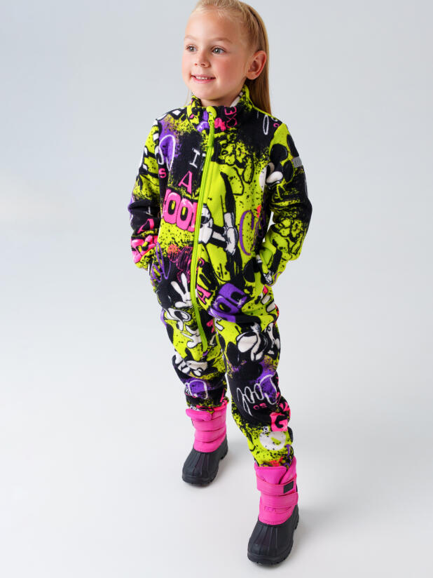 Комбинезон выполнен из мягкого флиса линии EXTRA WARM плотностью 290 г/м² с начесом, который отлично сохраняет тепло и обеспечивает комфорт ребёнку в прохладную погоду. Эластичные резинки на манжетах надёжно фиксируют рукава, не пропуская холодный воздух и ветер.