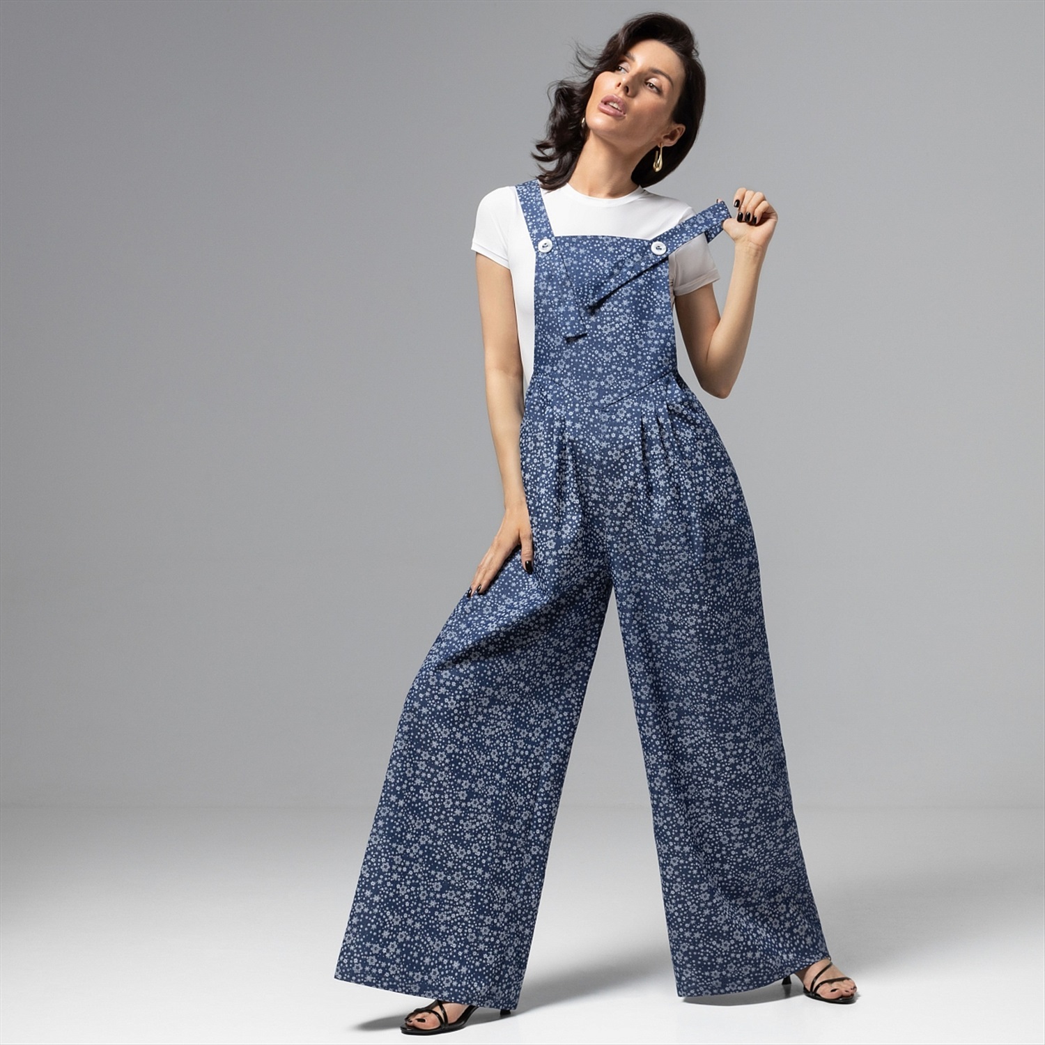 ТН ВЭД: 6204625900; Состав: «Джинс» (95% хлопок, 5% спандекс); Плотность ткани: Плотная; Тип ткани: Текстиль; Вид застежки: Пуговица/-ы; Высота посадки: Высокая; Дополнительный цвет ткани: Белый; Карманы: Подрезные; Основной цвет ткани: Синий; Подклад: Нет; Резинка по талии: Нет; Рисунок/раппорт: Каждое изделие уникально из-за расположения рисунка на ткани; Сезон: Круглогодичный; Силуэт: Свободный; Стиль: Повседневный; Фасон брюк: Палаццо