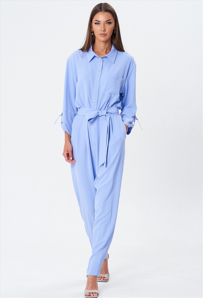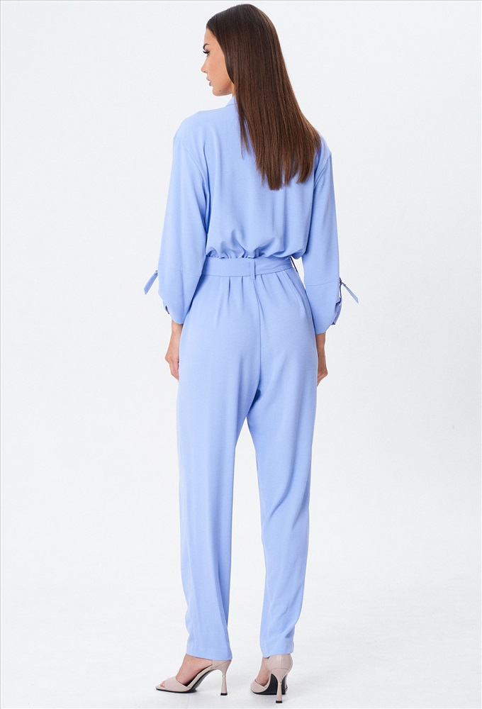 Комбинезон свободного силуэта, отрезной по линии талии. По переду один накладной карман нагрудный.