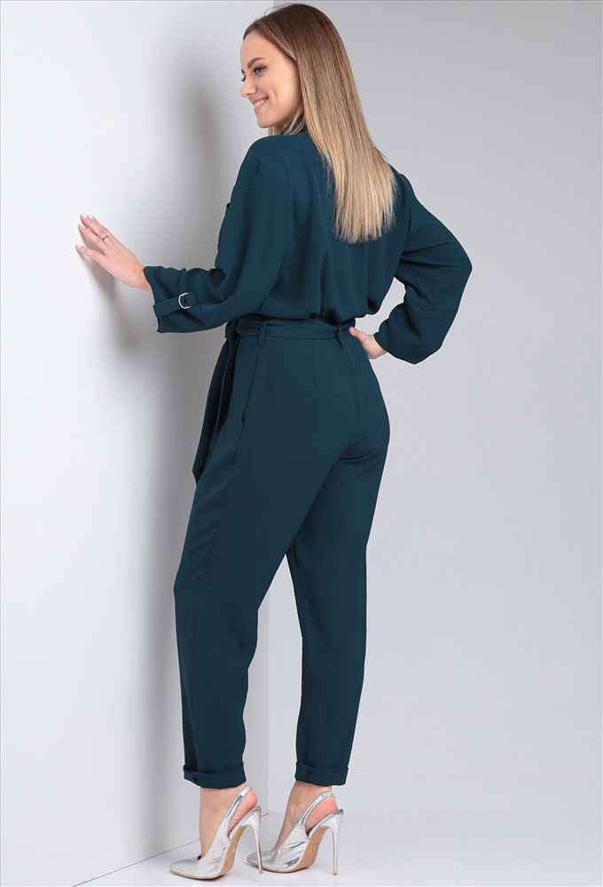 Комбинезон свободного силуэта, отрезной по линии талии. По переду один накладной карман нагрудный.