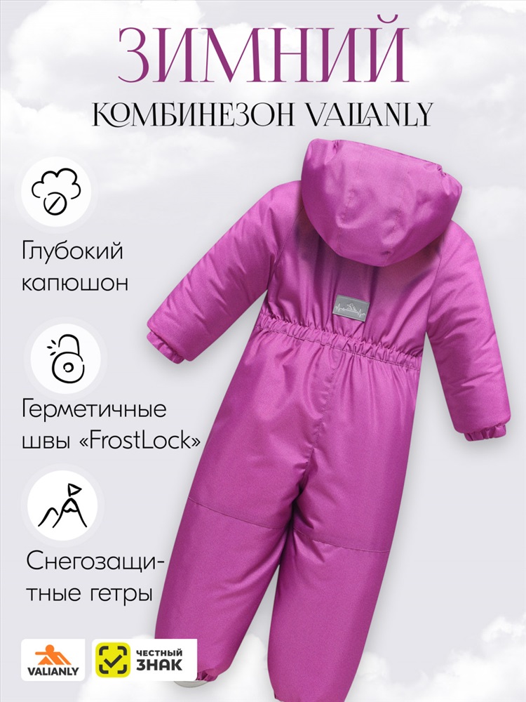 Производитель: VALIANLY; Артикул: 9402R; Бренд: VALIANLY; Пол: Девочка; Сезон: Зима; Страна производителя: Китай; Тип: Комбинезон; Цвет: Розовый; Рост: от 92 до 122; Диапазон температур: °С от + 5° до -25°; Водонепроницаемость: 10 000 мм; Комплектация: Комбинезон/Капюшон/Силиконовые штрипки; Состав: 100% Полиэстер; Материал: Мембранные материалы, Полиэстер, Плащевка, Тефлон; Материал подкладки комбинезона: Полиэстер/с начесом; Материал подкладки капюшона: Полиэстер/с начесом; Материал подкладки воротника: Полиэстер/с начесом; Материал наполнителя: Тинсулейт; Фактура материала: сетка; Утеплитель, гр: от 340 до 480 гр; Плотность утеплителя (г/кв.м): 220; Покрой: свободный; Длина подола: Средняя длина; Тип рукава: Длинная на манжете; Внутренние карманы: Нет; Тип кармана: Прорезной на молнии; Форма воротника: Стойка; Фиксаторы: Без фиксатора; Опции капюшона: Съемный на кнопке; Декоративные элементы: Значки, Лейбл, Пояс/ремень, Капюшон; Внутренние швы: Проклеены; Вид застежки: Молния/Липучки/Клапан; Особенности модели: family look, ветрозащита, водоотталкивающий материал, гипоаллергенный материал, с начесом, светоотражающие детали; Вид одежды: Горнолыжная/Свободная/Утепленная модель; Стиль: Повседневный, Спортивный; Рисунок: Надписи, Логотип, Однотонный, Светится в темноте, Клетка; Коллекция: Осень-зима 2024; Тренд: бэби-долл; Тип упаковки: Пакет; Цвет комплекта: розовый, фиолетовый; Габариты (ДхШхВ): 57 x 41 x 9 см; Вес: 1.2 кг
