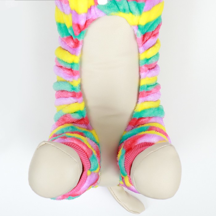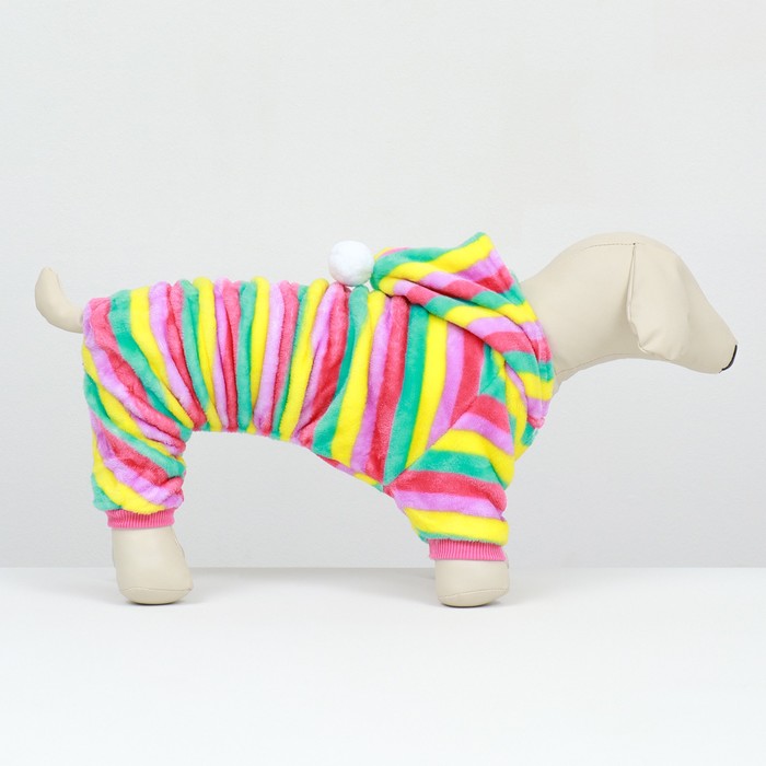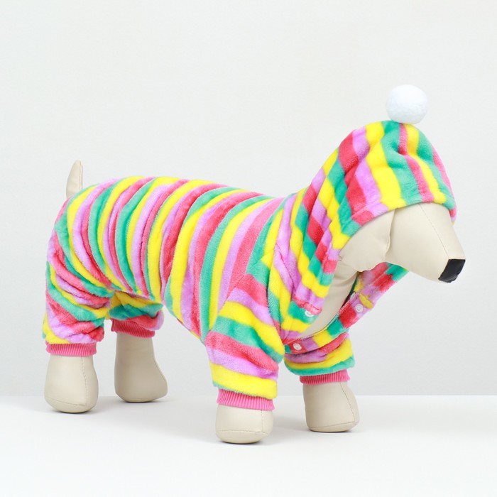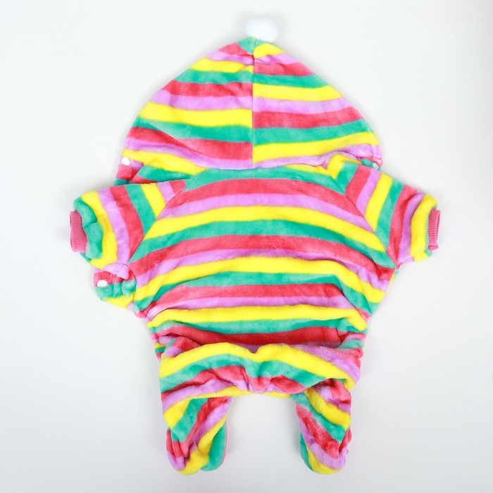 Представляем вам полосатый комбинезон «Радуга» с капюшоном для собак – идеальное сочетание стиля и комфорта для вашего четвероногого друга!Подойдёт для собак средних пород.Этот уникальный комбинезон выполнен в ярких и красочных цветах радуги, которые привлекут внимание в любом месте. Он отлично подчеркнет индивидуальность вашего питомца и сделает его настоящей звездой на прогулке.Комбинезон изготовлен из высококачественных материалов, обеспечивающих не только комфорт, но и защиту вашей собаки в холодное время года. Костюм имеет прочные швы, которые гарантируют долговечность изделия и устойчивость к истиранию.Капюшон не только добавляет модный акцент, но и защищает голову вашей собаки от холодного ветра и дождя. Комбинезон легко надевается и снимается. Кроме того, он имеет эластичные резинки по брючинам и манжетам, обеспечивающие идеальную посадку, предотвращая проникновение холодного воздуха.Стильный и удобный комбинезон «Радуга» с капюшоном для собак – это не только модный аксессуар, но и надежная защита вашего питомца от холода и плохой погоды. Подарите своей собаке комфорт и стиль – заказывайте сейчас!