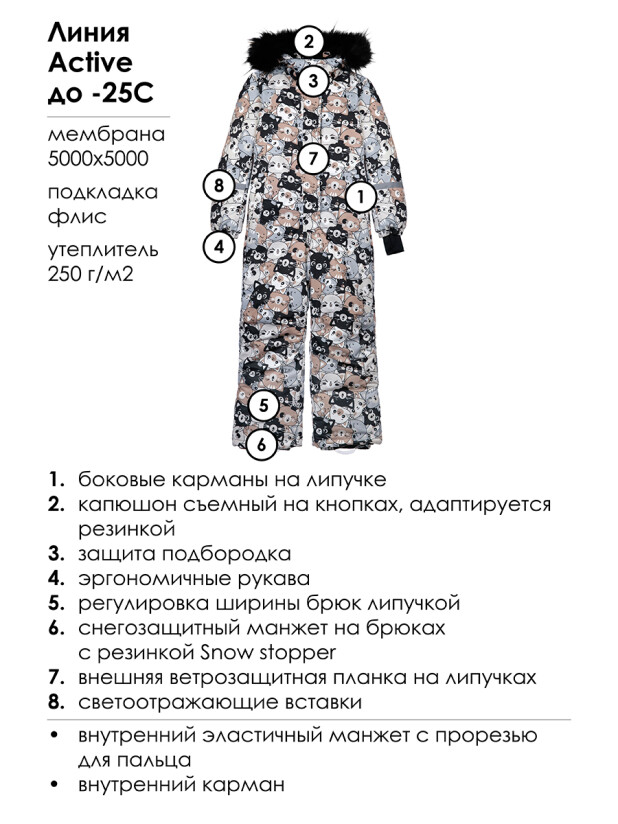 + снегозащитные манжеты — фиксируют брючины комбинезона на обуви, предотвращая попадание снега