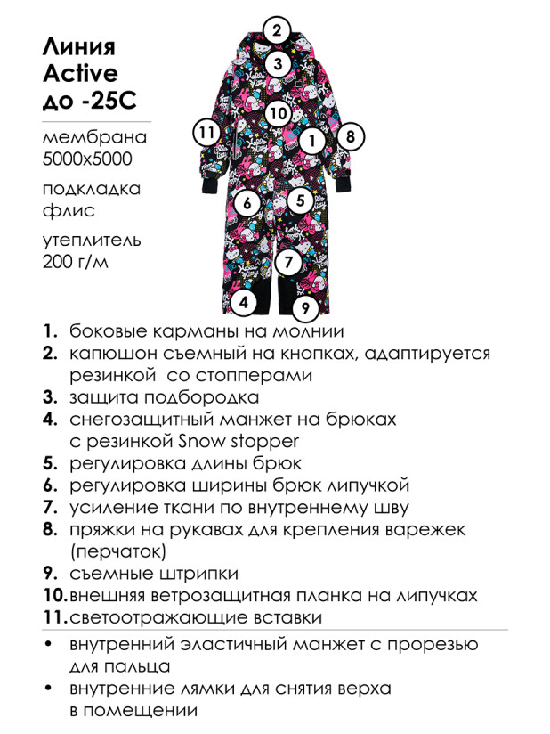внешняя ветрозащитная планка на липучках; светоотражающие вставки; Утепленный горнолыжный комбинезон - идеальный выбор для активного отдыха на свежем воздухе в зимний период. Инновационный утеплитель и флисовая подкладка сохраняют тепло морозную погоду.