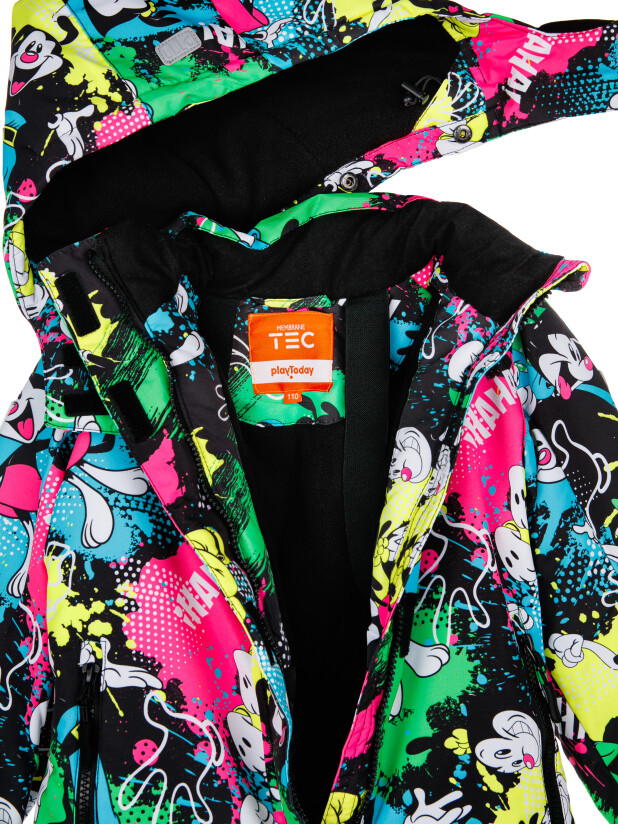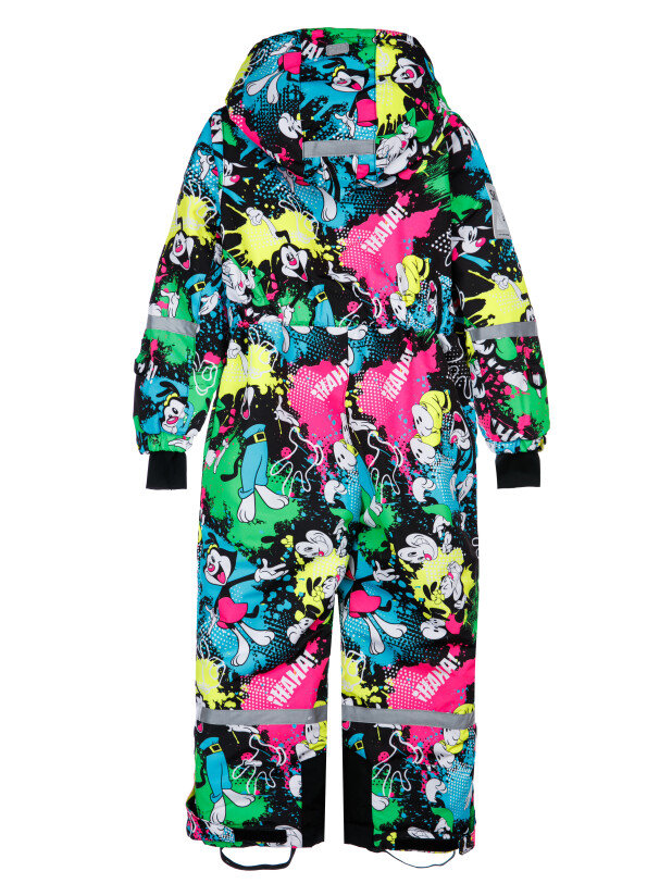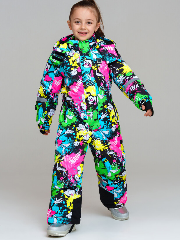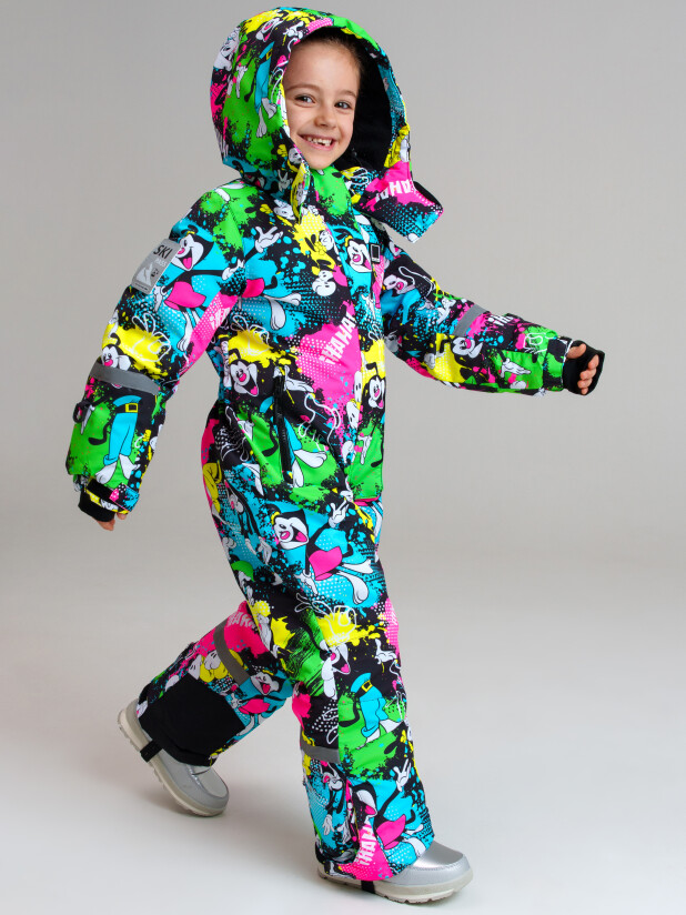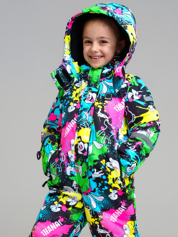 Мембранный материал делает этот яркий и модный комбинезон непромокаемым: мембрана не пропускает влагу снаружи, но выводит её изнутри, что крайне важно во время подвижных игр и занятий спортом.
