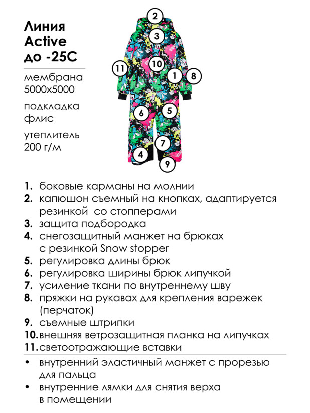 внешняя ветрозащитная планка на липучках; светоотражающие вставки; Утепленный горнолыжный комбинезон - идеальный выбор для активного отдыха на свежем воздухе в зимний период. Инновационный утеплитель и флисовая подкладка сохраняют тепло морозную погоду.