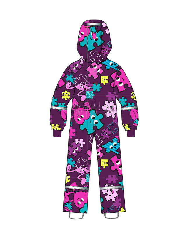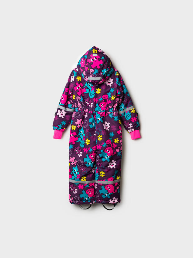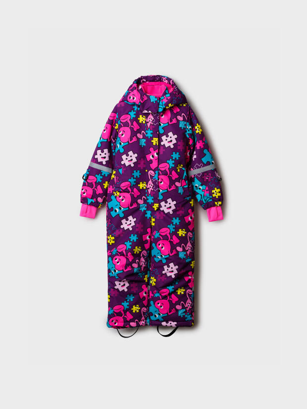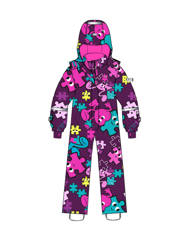 Комбинезон выполнен из прочных материалов с мембраной, что делает его водонепроницаемым и ветрозащитным, при этом позволяя коже дышать. Флисовая подкладка добавляет мягкости и тепла, обеспечивая комфорт в холодные дни. Съемный капюшон на резинке легко регулируется и защищает голову от ветра и осадков.