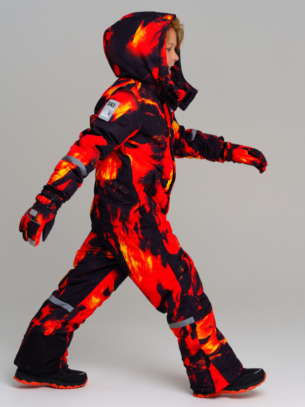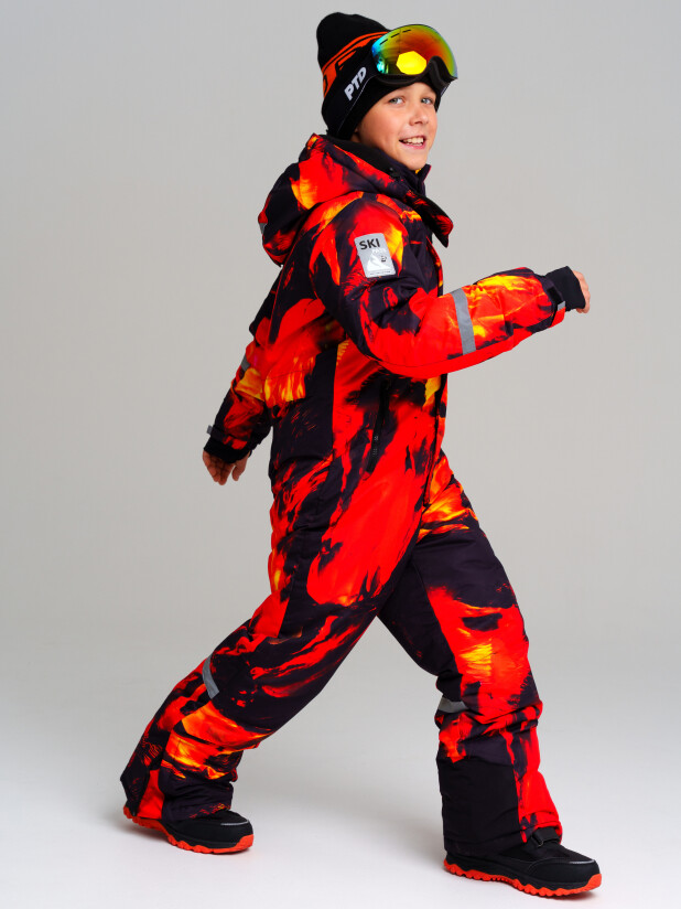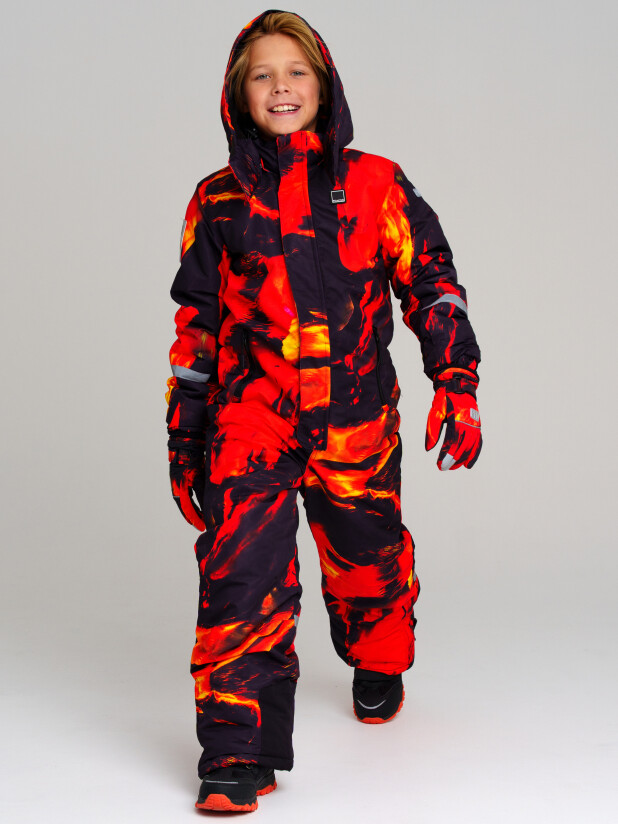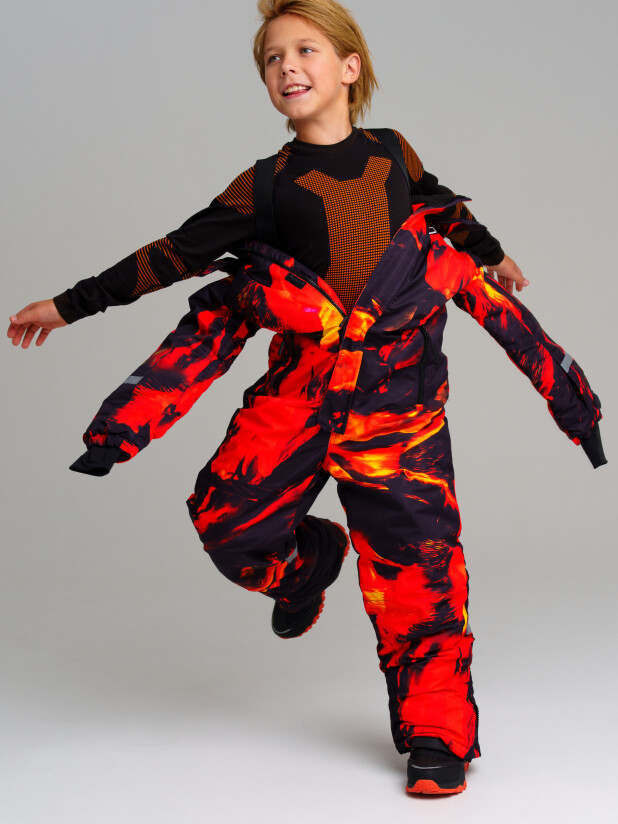 Мембранный материал делает этот яркий и модный комбинезон непромокаемым: мембрана не пропускает влагу снаружи, но выводит её изнутри, что крайне важно во время подвижных игр и занятий спортом.