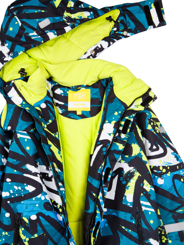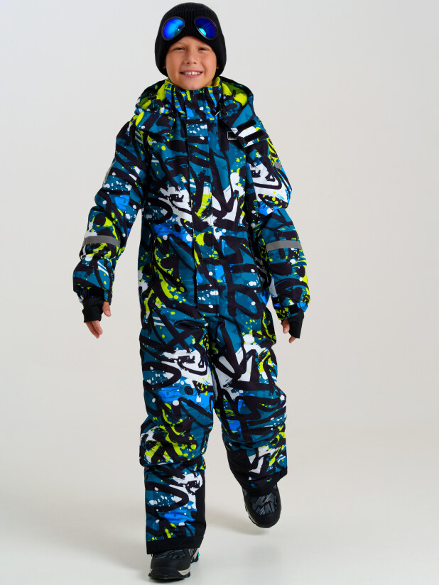 Мембранный материал делает этот яркий и модный комбинезон непромокаемым: мембрана не пропускает влагу снаружи, но выводит её изнутри, что крайне важно во время подвижных игр и занятий спортом.