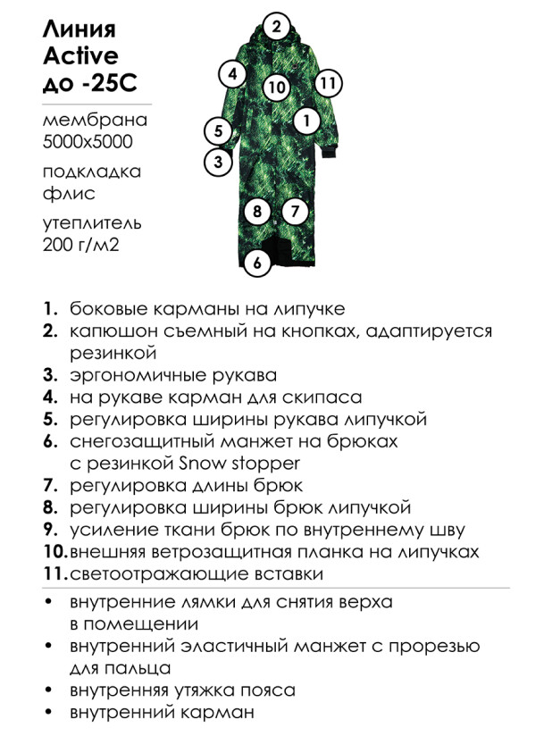внешняя ветрозащитная планка на липучках; светоотражающие вставки; Утепленный горнолыжный комбинезон - идеальный выбор для активного отдыха на свежем воздухе в зимний период. Инновационный утеплитель и флисовая подкладка сохраняют тепло морозную погоду.