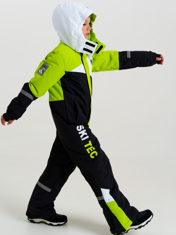 Мембранный материал делает этот яркий и модный комбинезон непромокаемым: мембрана не пропускает влагу снаружи, но выводит её изнутри, что крайне важно во время подвижных игр и занятий спортом.