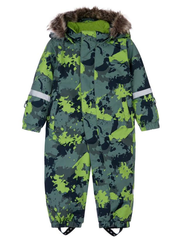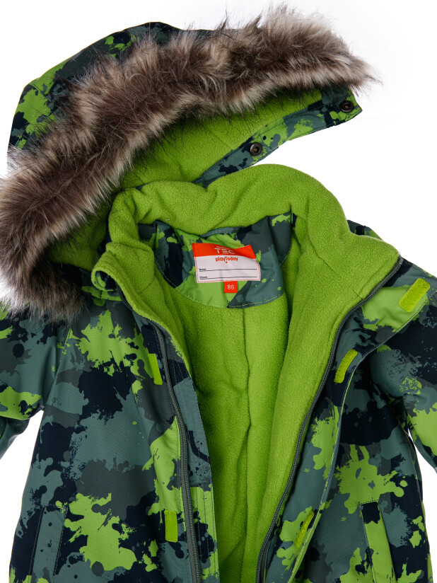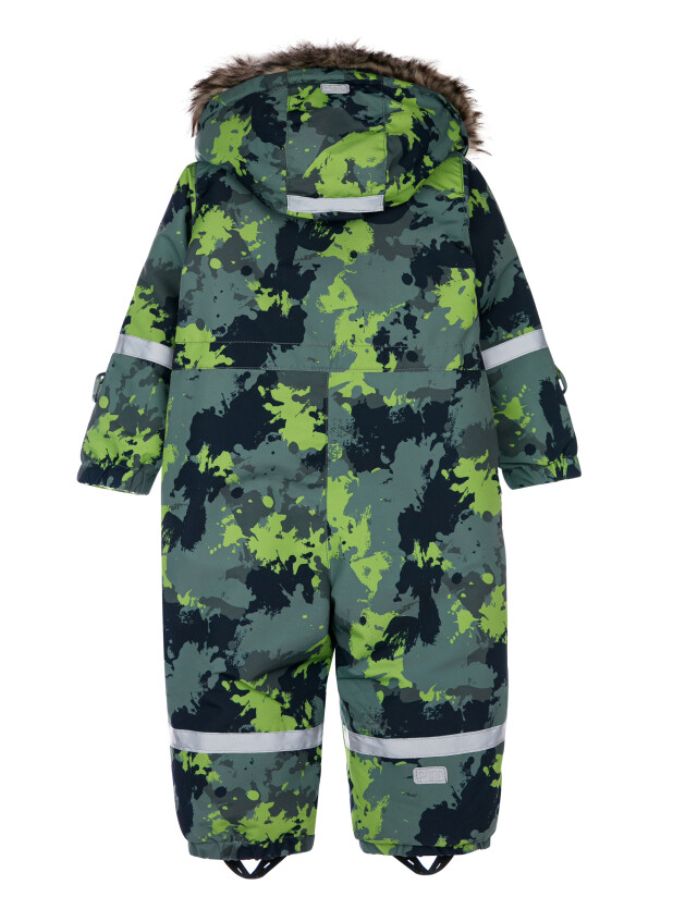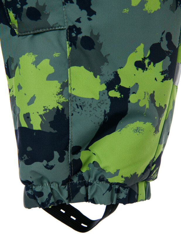 Мембранный материал делает этот яркий и модный комбинезон непромокаемым: мембрана не пропускает влагу снаружи, но выводит её изнутри, что крайне важно во время подвижных игр и занятий спортом.