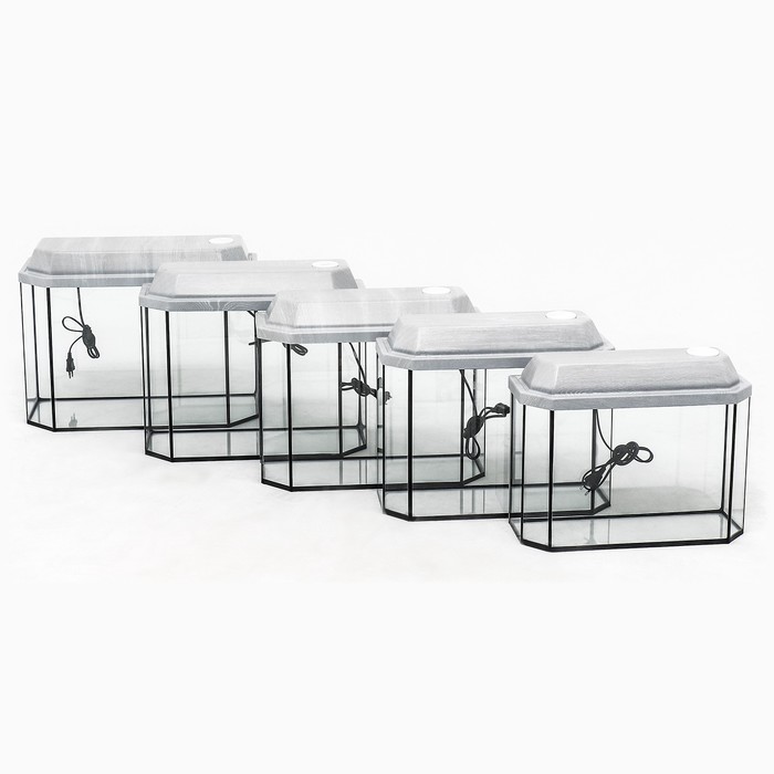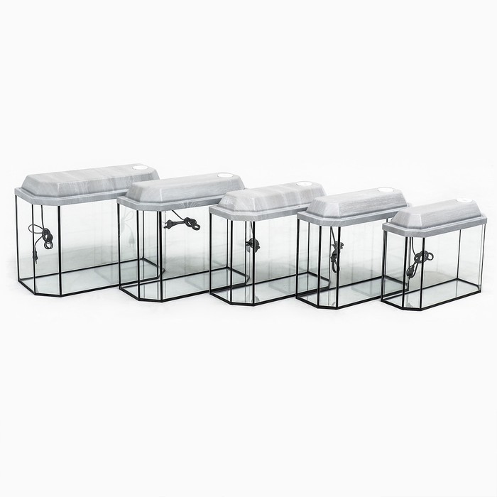 Комплект аквариумов "Матрёшка" Панорамные пять штук, выполнены из высококачественного стекла, благодаря евро кромке имеют высокую защиту от трещин, сколов, что повышает степень безопасности при эксплуатации. Также крышка надежно защищает аквариум от пыли, оснащена патроном под лампу Е14, что дает возможность создавать оптимальное освещение для растительности и рыбок Панорамное смотровое стекло увеличивает угол обзора – можно наблюдать за водной жизнью почти из любого угла комнаты. Оригинально вписать емкость с рыбами в интерьер поможет панорамный аквариум. Указан номинальный объём аквариума.