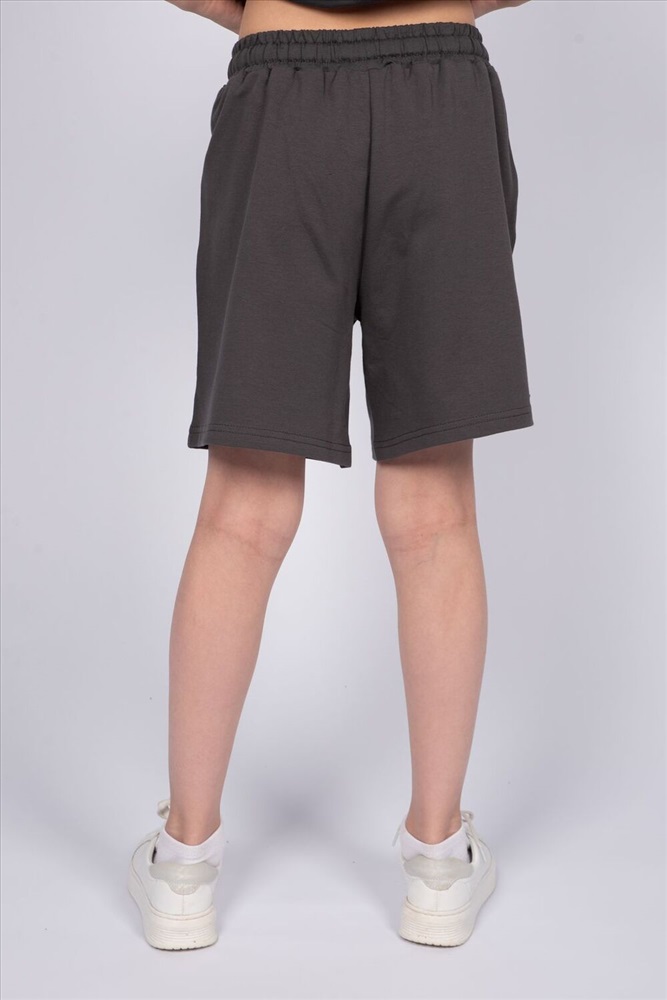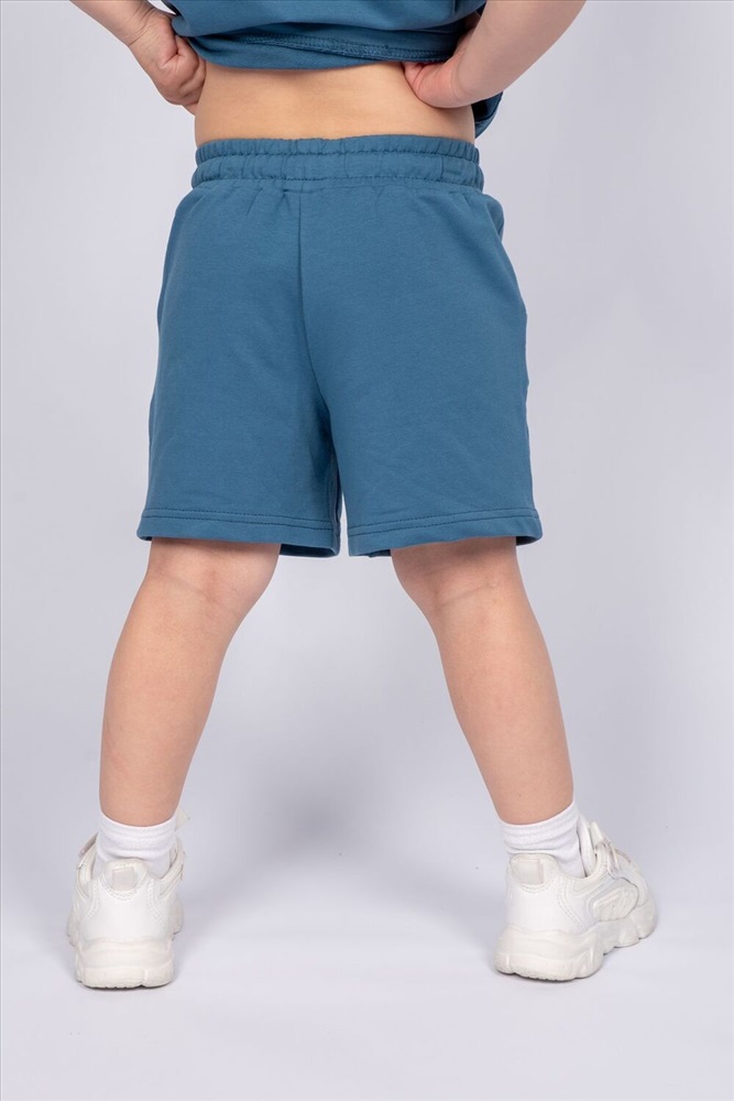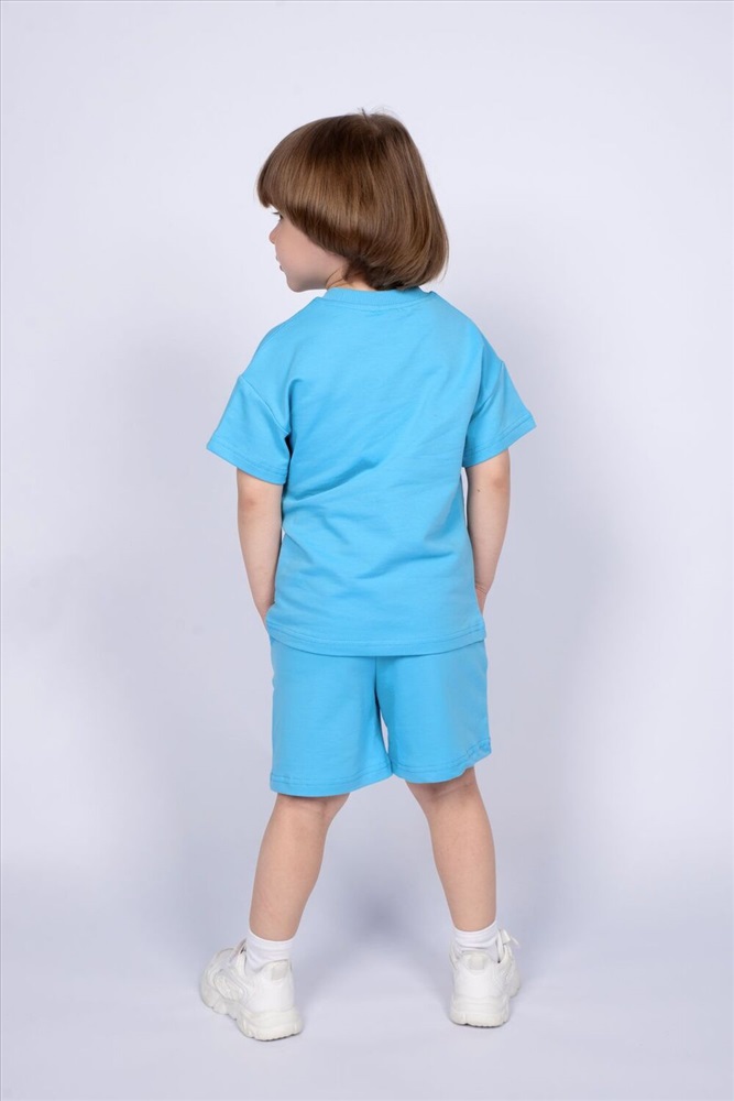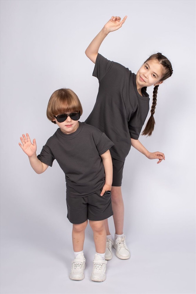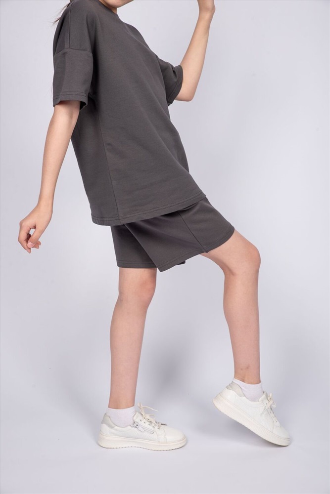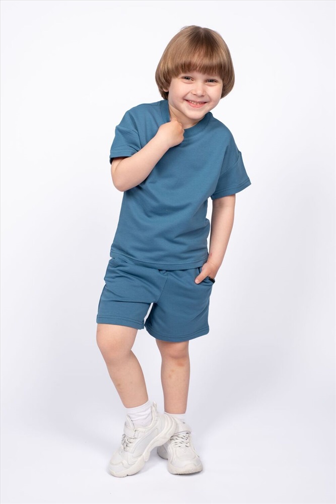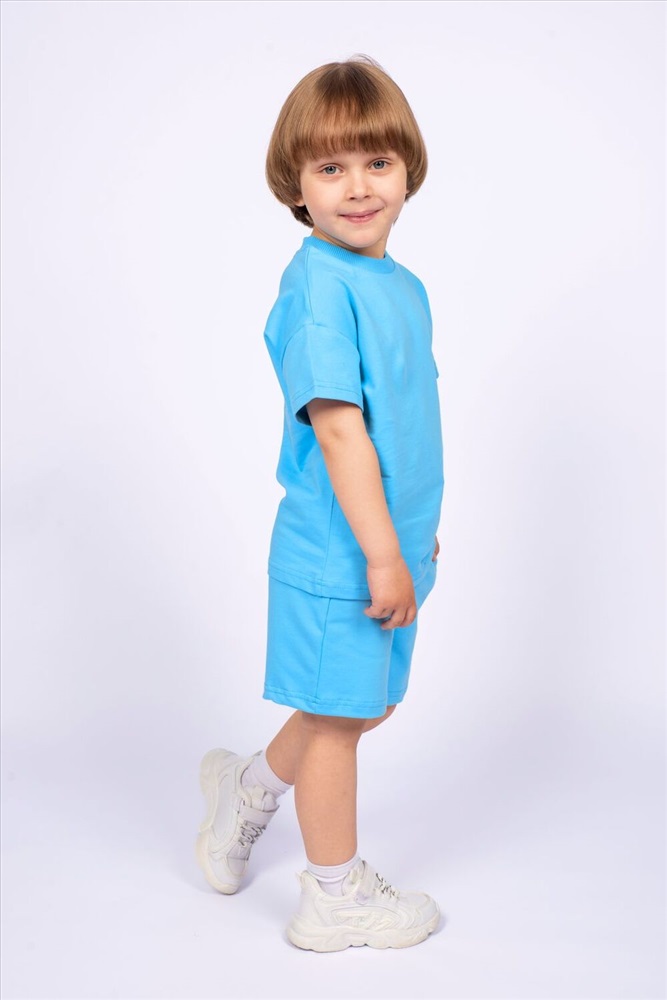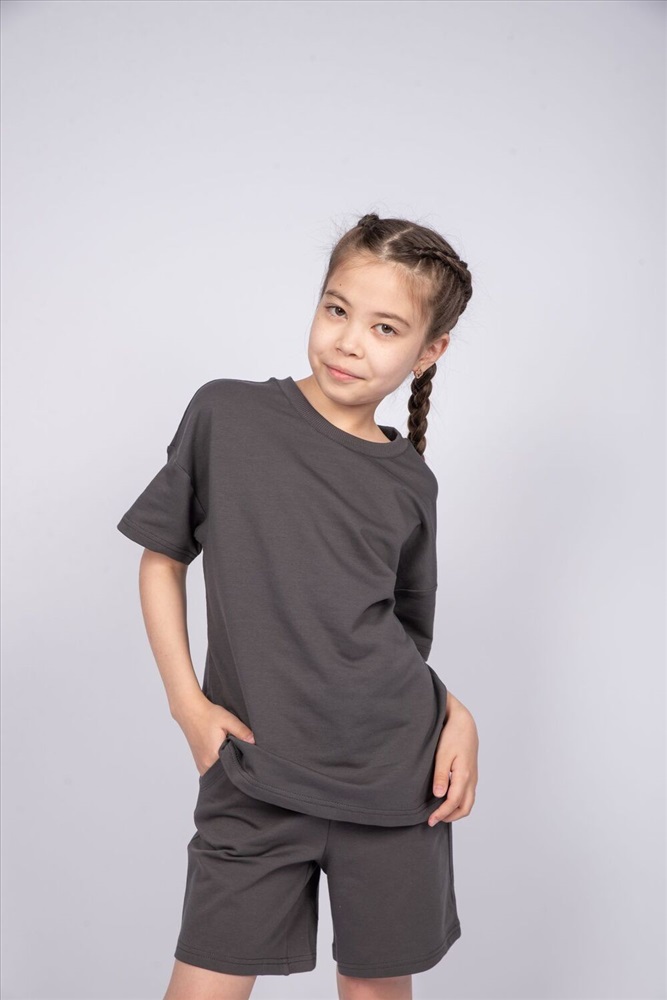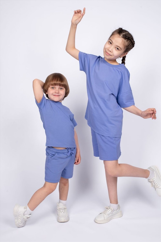 Комплект детский, состоящий из футболки и шорт. Футболка оверсайз с фигурным низом и спущенным рукавом. Горловина круглая, обработана воротником из кашкорсе. Горловина спинки внутри укреплена бейкой из кулирки. Низ изделия и рукава обработан швом вподгибку. Шорты прямого силуэта. Отрезной пояс, в цвет изделия, из основного полотна с эластичной тесьмой внутри. По поясу шорт вставлен плоский утягивающий шнурок. Длина шнурка = длина пояса + 45 см для возможности завязывания. На передней половинке шорт карманы с отрезным бочком. Низ изделия обработан швом в подгибку.