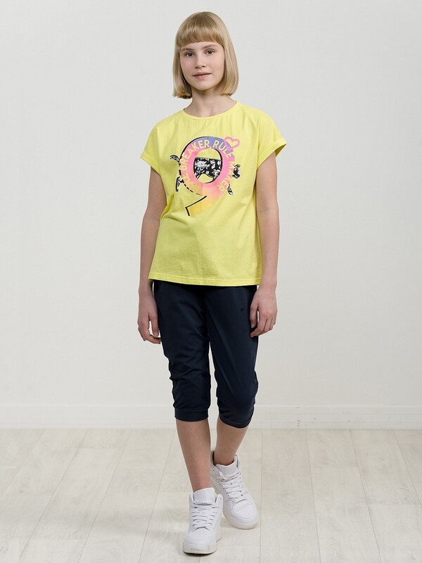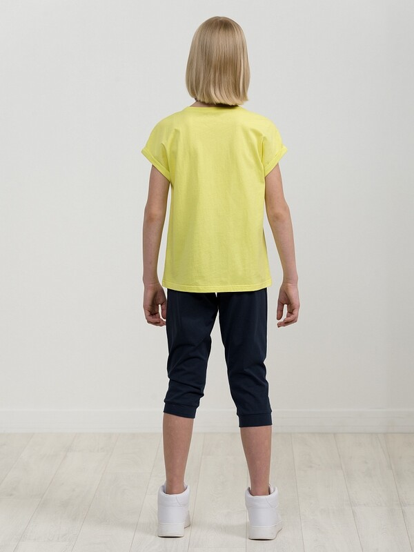 Состав: верх: 100%хлопок, низ: 100%хлопок Комплект для девочек футболка и бриджи. Футболка актуального оверсайз силуэта. Спущенная линия плеча, отворот манжета из основной ткани. Стойкий эластичный принт в стиле граффити. Перевод Тот, кто создает правила. Тот, кто нарушает правила. Бриджи расслабленной формы с дополнительной регулировкой объема шнуром и манжетами из основной ткани. Комментарии к товару