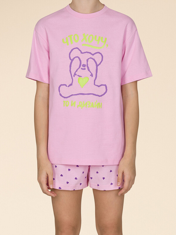 Стильная и уютная пижама актуального розового цвета для девочки. В составе ткани 100% хлопка — идеально для детской одежды! Модель приятна на ощупь, прекрасно пропускает воздух, позволяя коже ребёнка дышать. При этом в пижаме из хлопка ребёнку будет уютно, даже если он сбросит одеяло. Всё это обеспечивает комфортный и качественный сон. Свободная футболка и комфортные шорты, плечо немного спущено, рукава широкие — в пижаме очень удобно спать. Широкая и мягкая резинка в поясе не перекручивается и не давит. Отделка горловины из эластичной рибаны — она не растягивается, ребёнку удобно надевать и снимать пижаму. Шорты украшает сплошной принт в маленькие лиловые сердечки — по-девичьи нежно. Футболка декорирована позитивным принтом в виде милого медвежонка с сердечком и надписи "что хочу, то и дизайн". В линейке представлены детские пижамы следующих размеров: 2 (92); 3 (98); 4 (104); 5 (110); 6 (116), 7 (122); 8 (128); 9 (134); 10 (140); 11 (146). Хлопковый комплект идеален для сна и отдыха дома — прекрасный выбор для вашего ребёнка! Пижама с шортами для девочки подходит для круглогодичного использования. Домашний комплект — замечательный подарок дочке, внучке, сестре на любой праздник. Выбирайте нужный размер по таблице размеров на фото. Цвет товара на экране вашего устройства может отличаться от цвета изделия вживую.