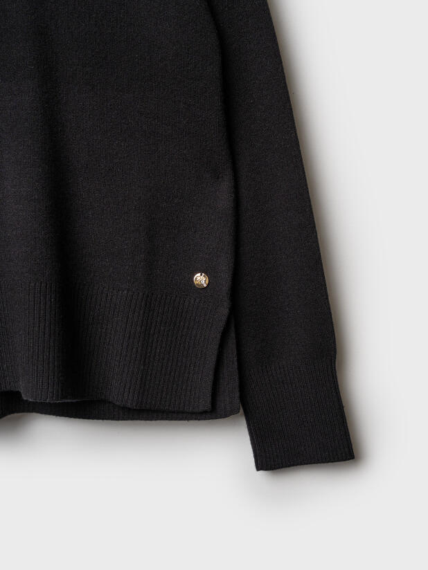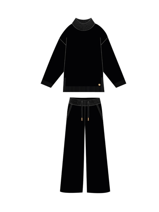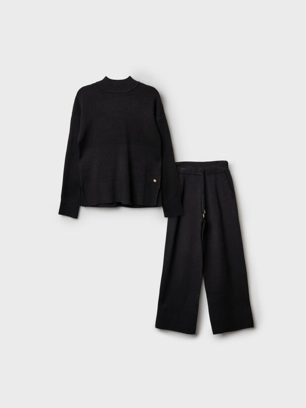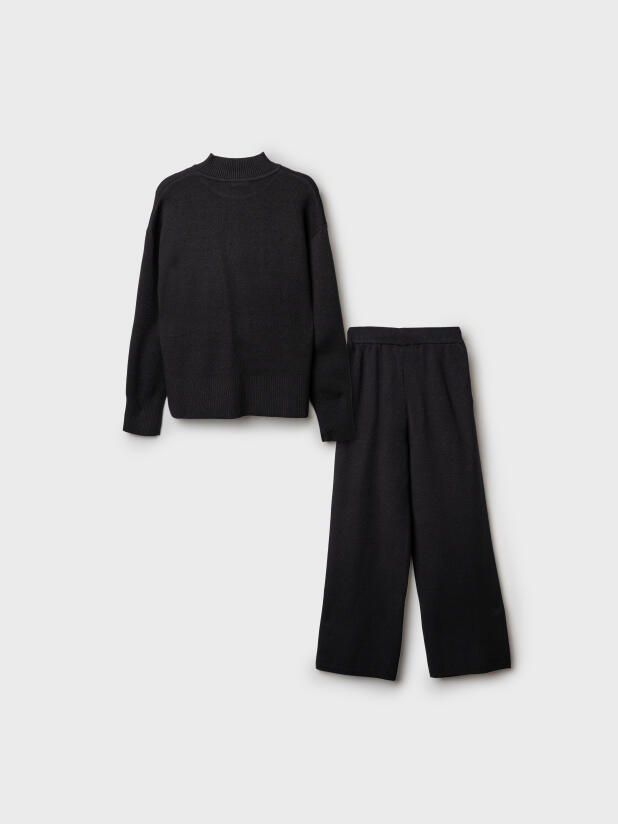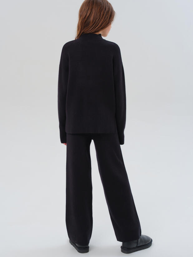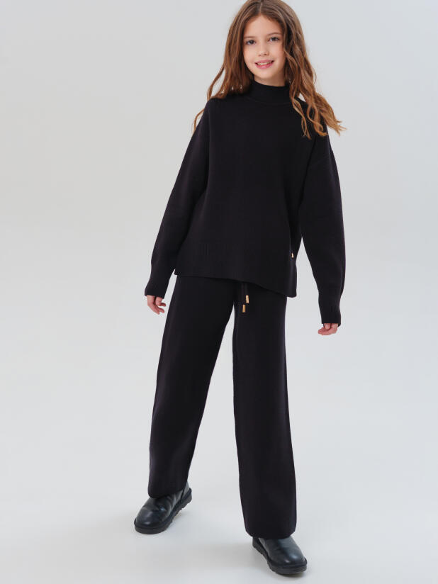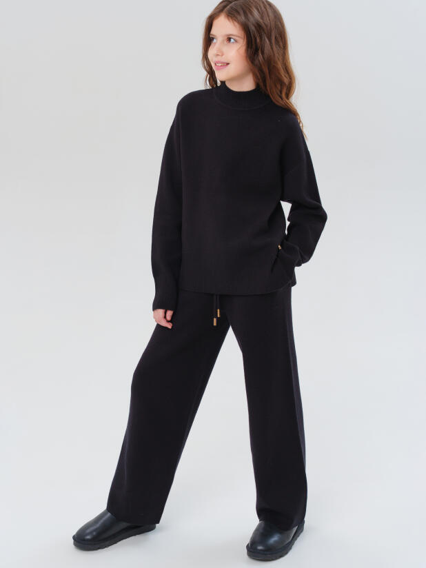 Вязаный черный трикотажный костюм для девочки подростка от PlayToday — это универсальный образ, который сочетает комфорт и стиль. В набор входят мягкий джемпер и прямые брюки с поясом на резинке и декоративным шнурком. Такой костюм станет практичной основой для повседневного гардероба девочки.