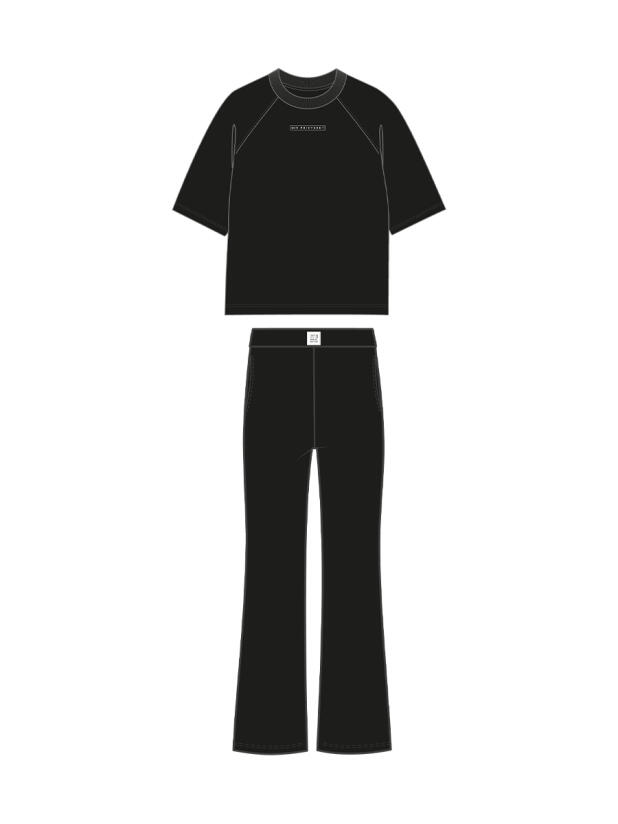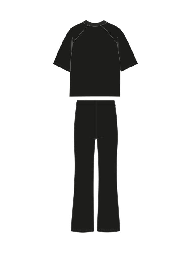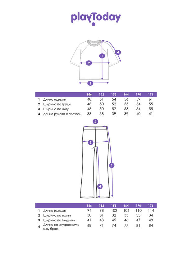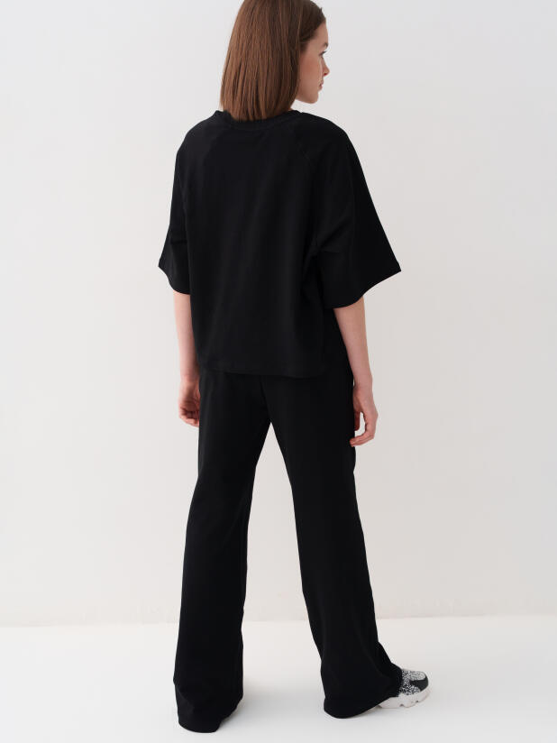 Комплект для девочки подростка. Состоит из оверсайз футболки с коротким рукавом и брюк клеш на резинке. Выполнен из хлопкового трикотажа. Футболка свободного кроя, с круглым вырезом. На передней части расположен аккуратный принт. Брюки длинные, расклешённые книзу, с высокой посадкой и эластичным поясом. По бокам предусмотрены удобные карманы.