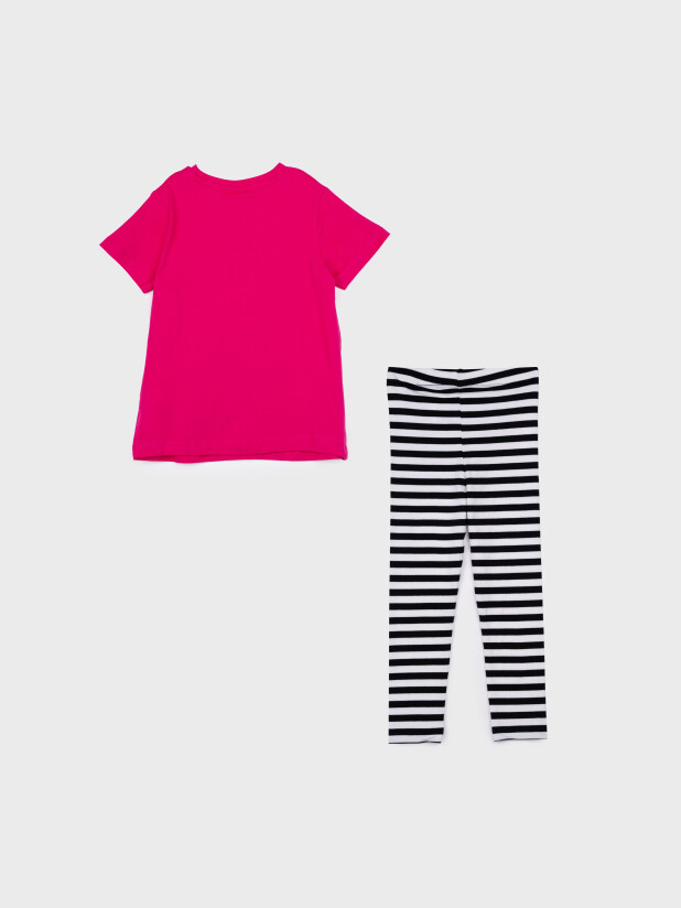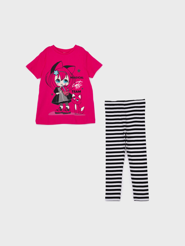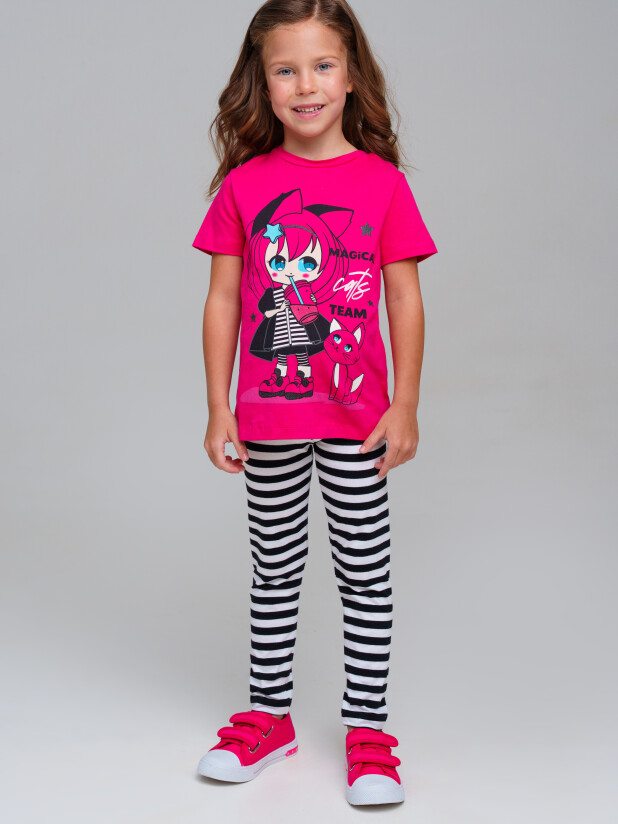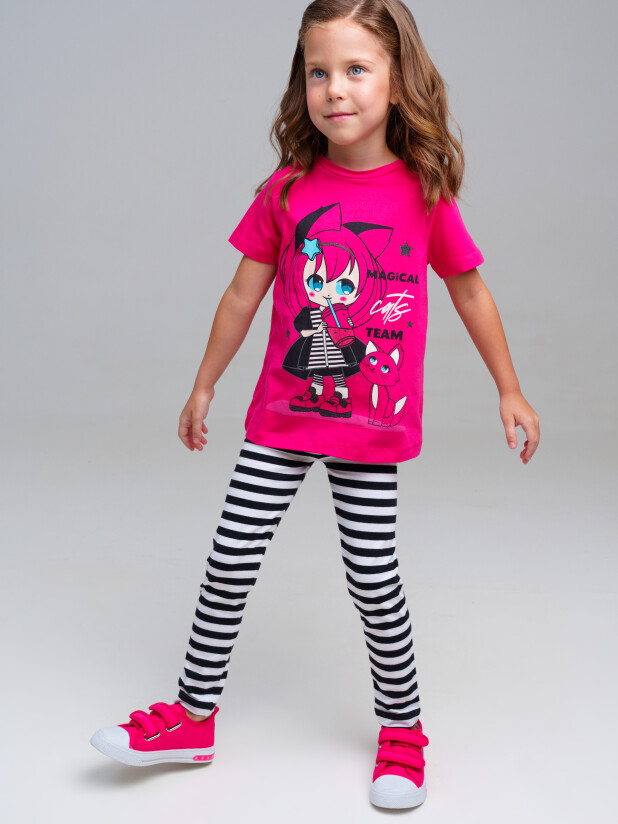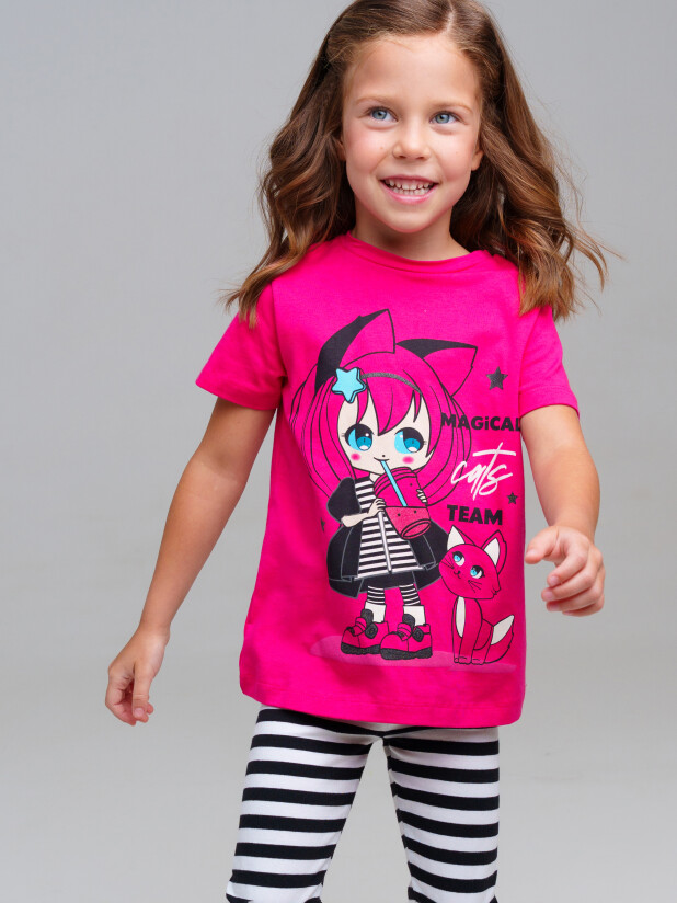 Модный детский костюм для девочки: футболка, брюки из качественного и приятного на ощупь трикотажа джерси. Футболка: высокое содержание хлопка 95%. Благодаря наличию эластана в составе ткани изделие проще в уходе и держит форму. Легинсы из рома джерси. Эластичный пояс. Модель из капсульной коллекции CATS DREAM. Соберите полный образ в едином стиле! Костюм будет актуален для детского сада, в садик. Модель выполнена из качественного и приятного на ощупь трикотажа.