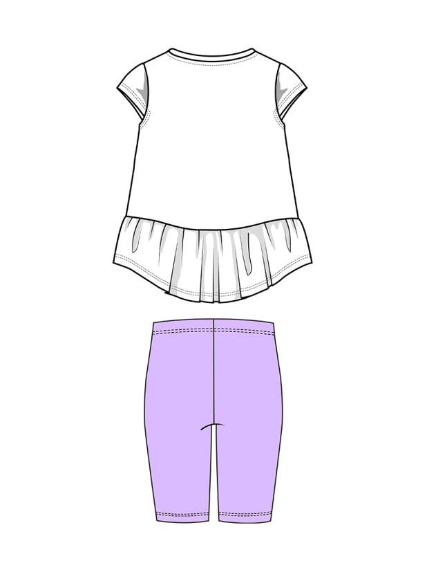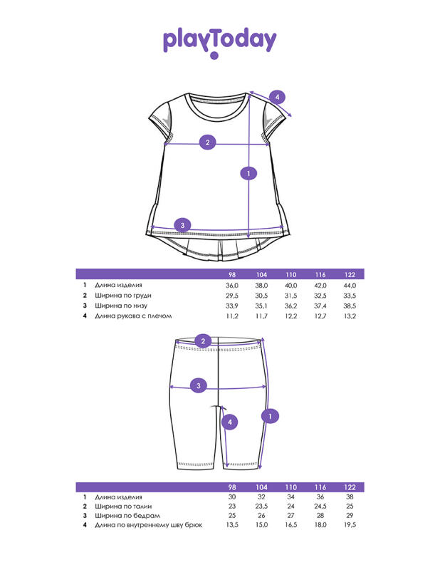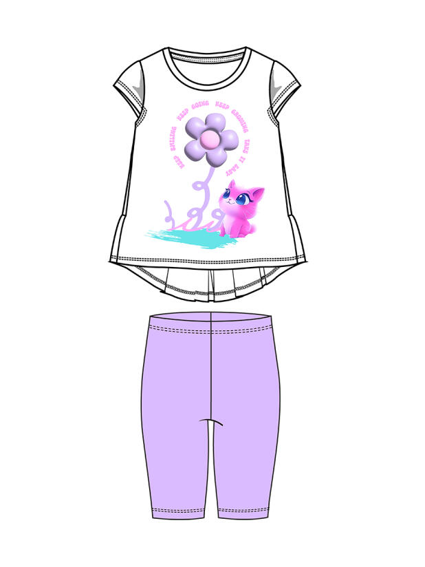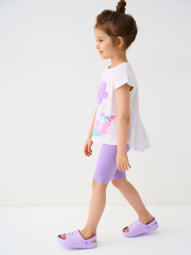 Детский комплект для девочки. Состоит из футболки прямого кроя, с короткими рукавами и укороченных легинсов. Футболка слегка удлиненная, с аккуратной сборкой внизу. На передней части размещен яркий декоративный рисунок с цветком и персонажем, дополненный объемной вышивкой, что делает модель выразительной и привлекательной. Легинсы облегающего силуэта, комфортно сидят по фигуре и хорошо тянутся. Пояс мягкий, на резинке, не сдавливает и подходит для активного движения.