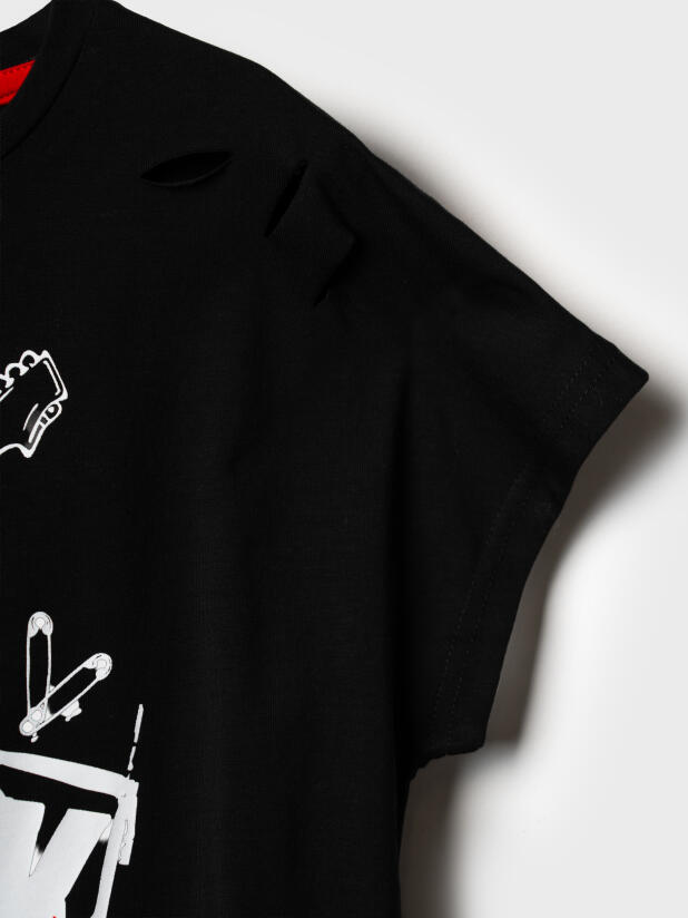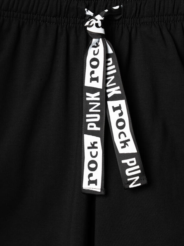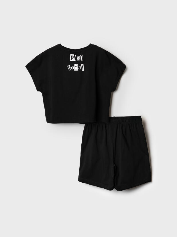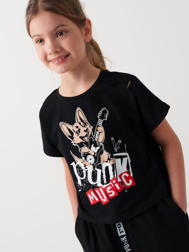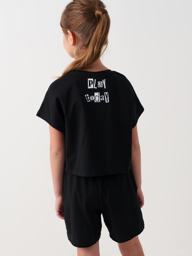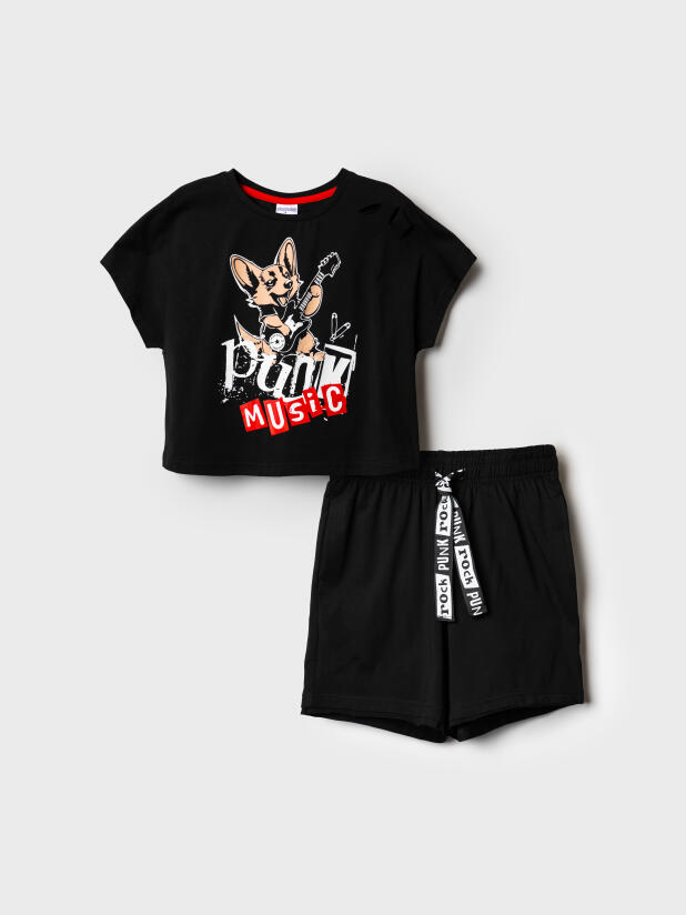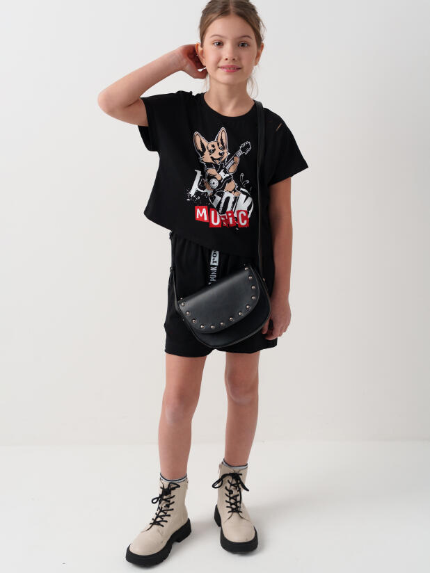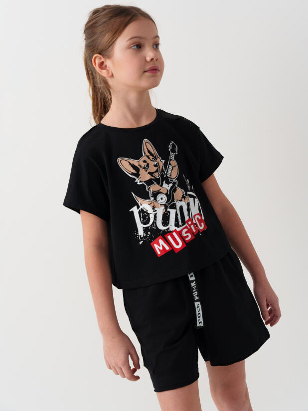 Стильный костюм для девочки подростка. Состоит из футболки с коротким рукавом и шорт. Укороченная футболка оверсайз с принтом. Декоративные разрезы. Шорты свободные, хорошо сидят на талии благодаря эластичному поясу и регулирующему шнурку. Удобные боковые карманы.