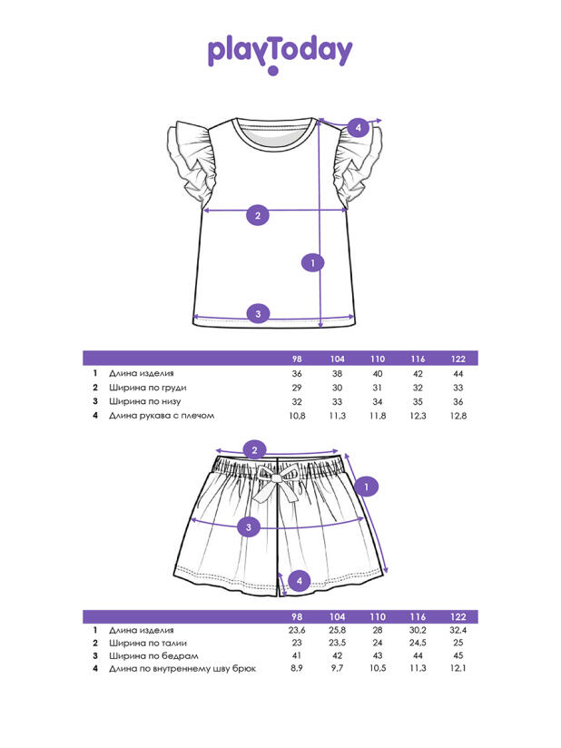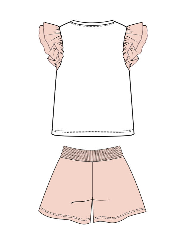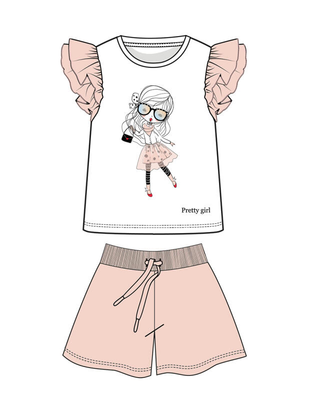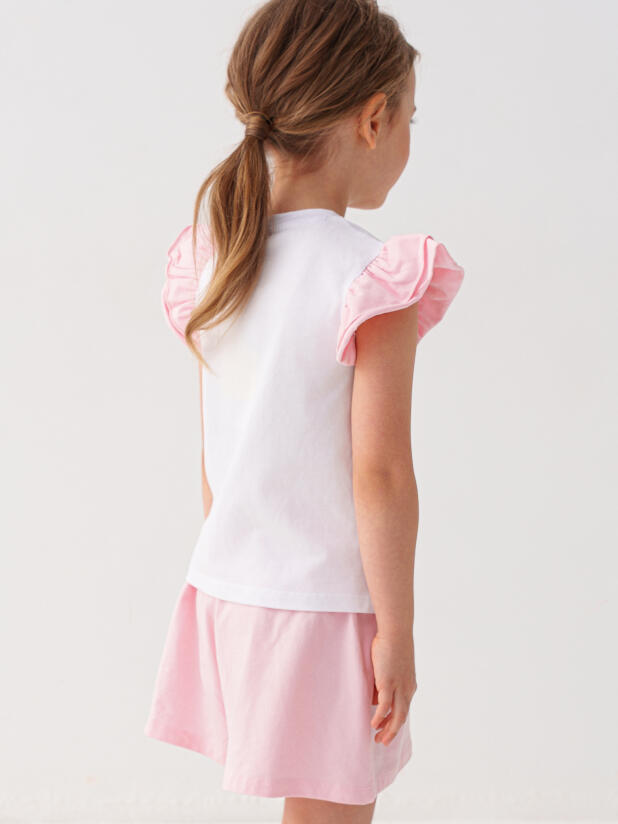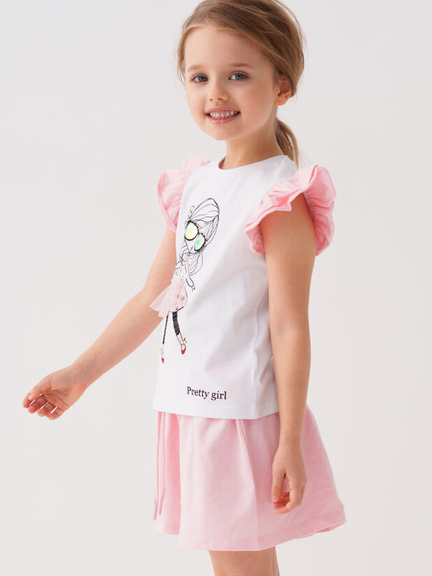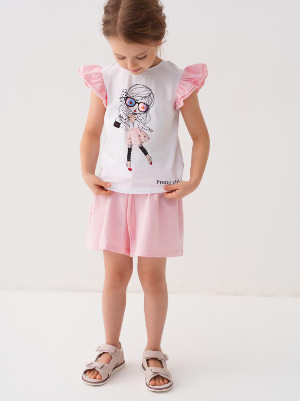 Детский костюм для девочки. Состоит из футболки с коротким рукавом и шорт. Выполнен из хлопкового трикотажа. Футболка прямого кроя, с рукавами-крылышками и красочным принтом. Шорты свободные, хорошо сидят на талии благодаря эластичному поясу и регулирующему шнурку.