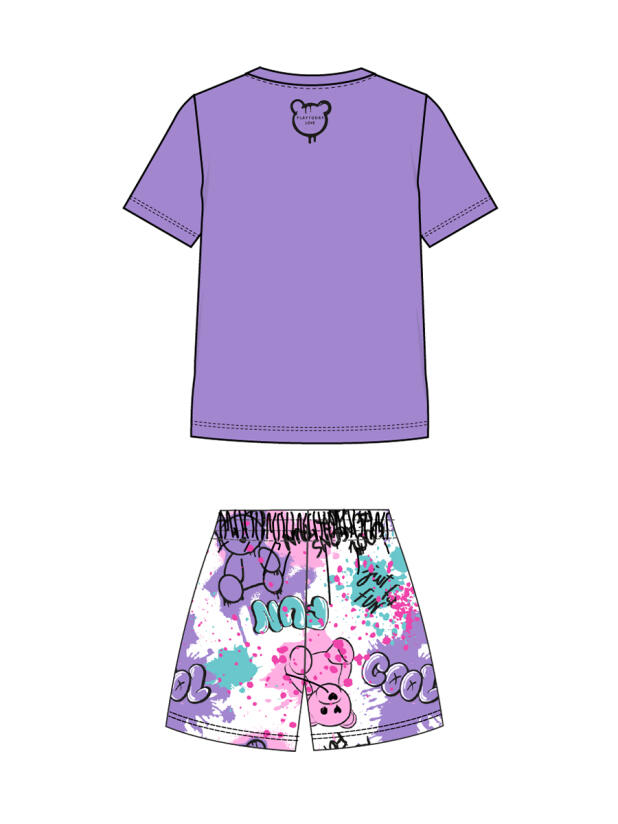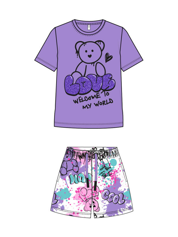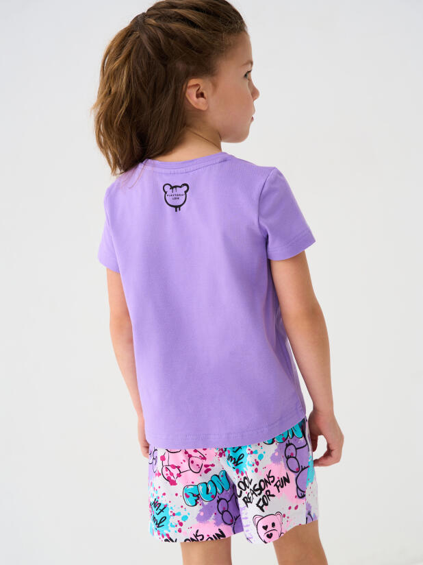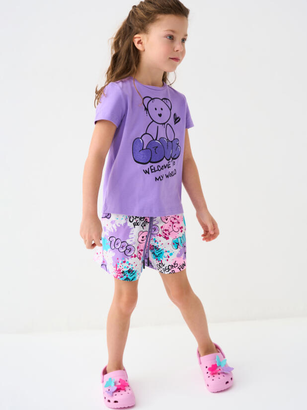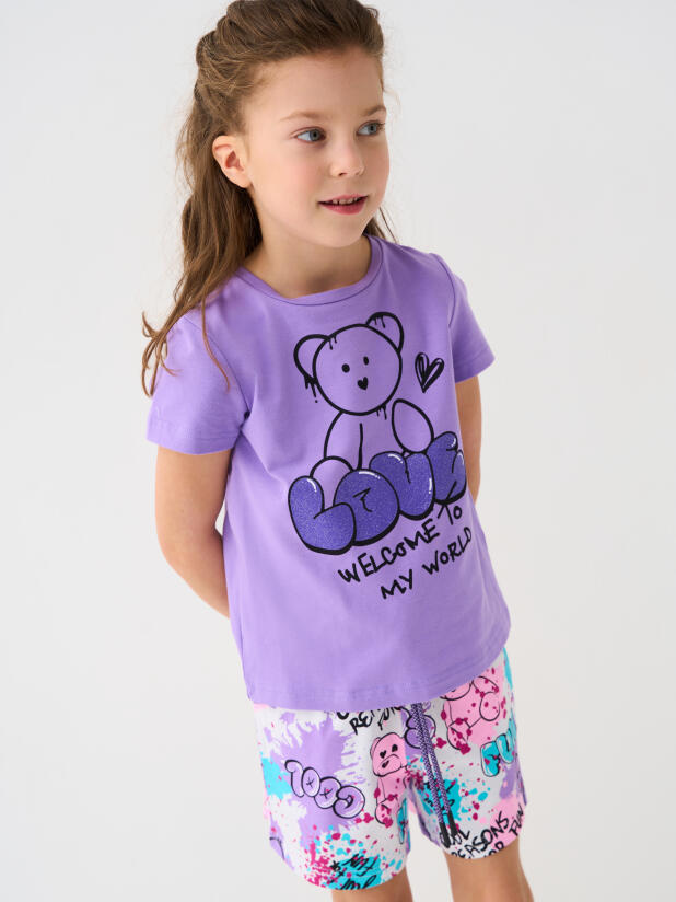 Детский костюм для девочки. Состоит из футболки с коротким рукавом и шорт. Выполнен из хлопкового трикотажа. Футболка прямого кроя, с красочным принтом с мишкой. Шорты свободные, хорошо сидят на талии благодаря эластичному поясу и регулирующему шнурку. Удобные боковые карманы.