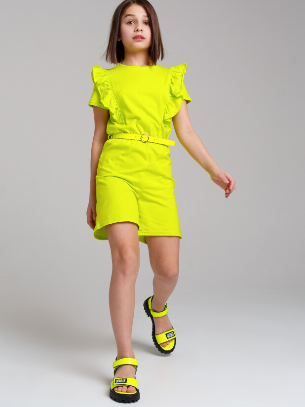 Комбинезон из качественного и приятного на ощупь трикотажа джерси. Высокое содержание хлопка 95%. Благодаря наличию эластана в составе ткани изделие проще в уходе и держит форму. Ремень.