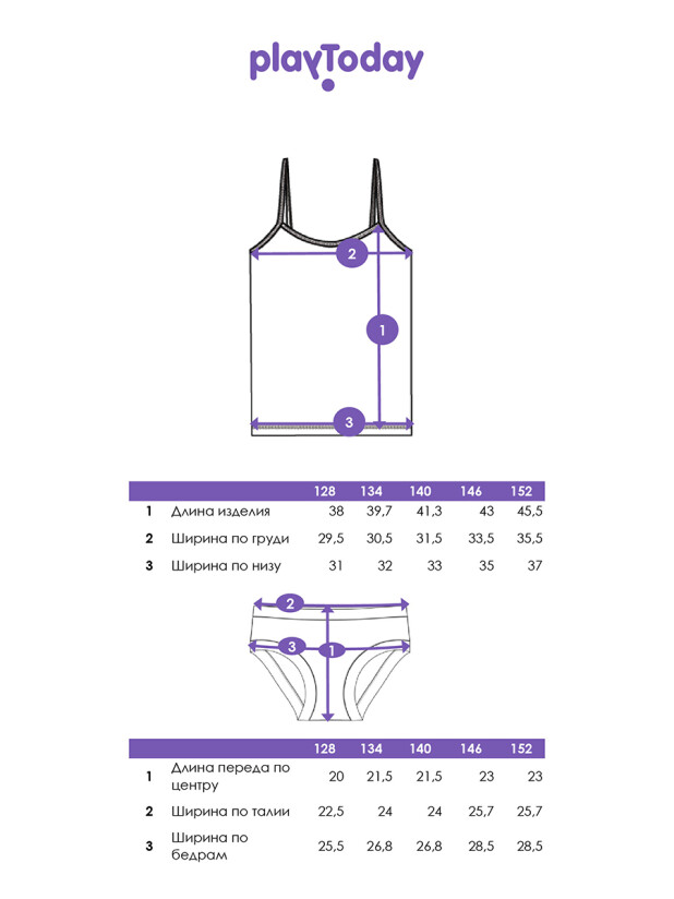 Классический комплект трикотажного белья для девочки подростка от PlayToday — комфортный выбор на каждый день, который заботится о нежной коже ребёнка. В наборе: майка на тонких бретелях и удобные бесшовные трусы-слипы. Мягкая ткань с высоким содержанием хлопка идеально подходит для ежедневной носки — в школе, дома и на прогулке.