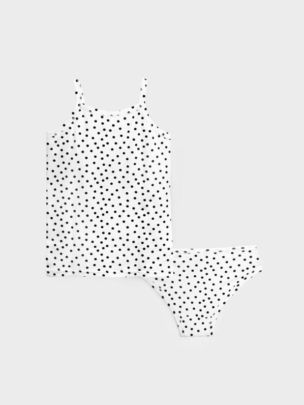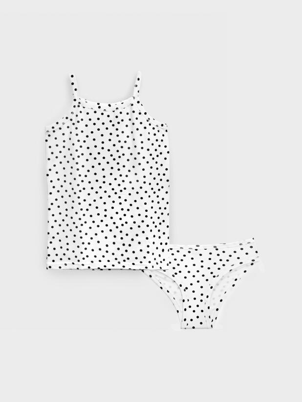Комплект белья детский для девочки. Комплект белья: майка и трусы-слипы. Майка на тонких нерегулируемых бретелях. Высокое содержание хлопка. Благодаря наличию эластана в составе ткани изделие проще в уходе и держит форму.