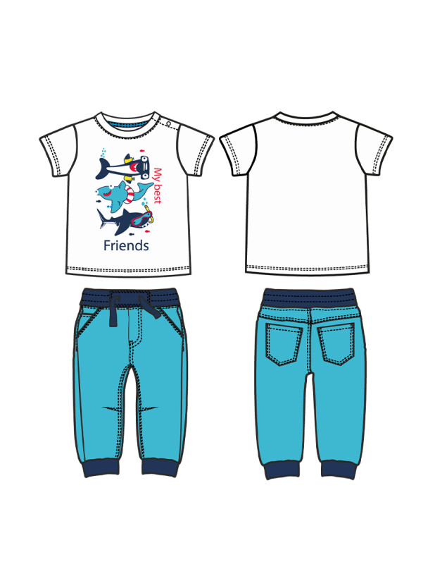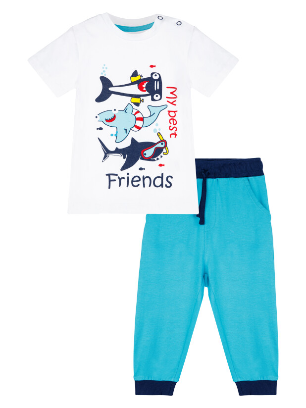 Комплект: футболка и брюки. Выполнен из качественного эластичного и приятного на ощупь трикотажа разных цветов. Застежка на кнопки на плече. Брюки с 4 карманами. Пояс со шнурком и манжеты по низу изделия. Высокое содержание хлопка 95%. Благодаря наличию эластана в составе ткани изделие держит форму и меньше мнется.