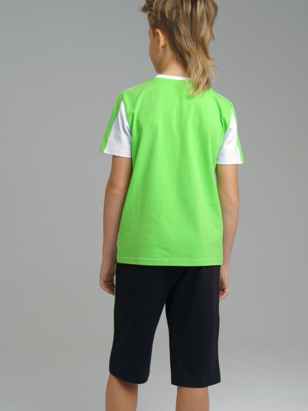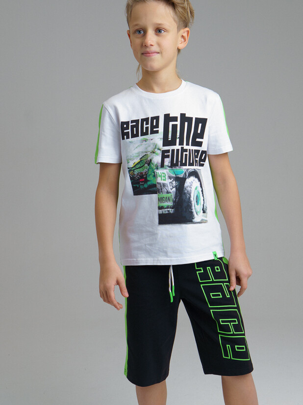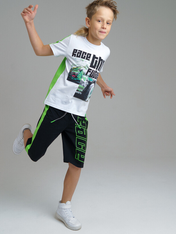 Комплект: футболка, шорты. Размер изделия на фото - 140, параметры модели (см): рост 146, обхват груди-талии-бедер: 67-63-71. Из качественного эластичного и приятного на ощупь трикотажа джерси. Высокое содержание хлопка 95%. Благодаря наличию эластана в составе ткани изделие держит форму и меньше мнется. Принт сохраняет первоначальный вид даже после многочисленных стирок. Эластичный пояс с тесьмой позволяет легко надевать и утягивать до идеальной посадки в зависимости от комплекции ребенка.