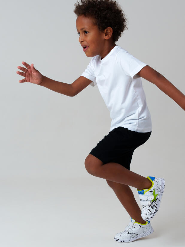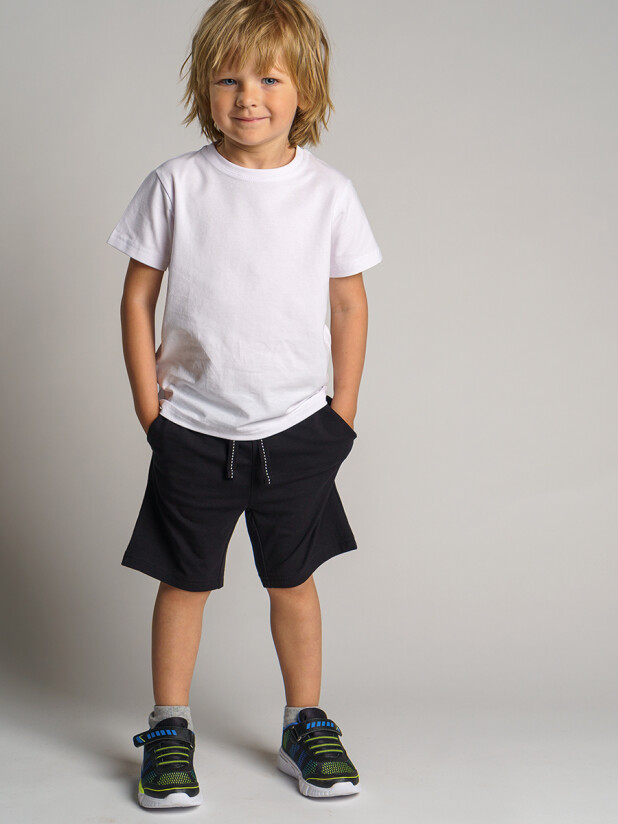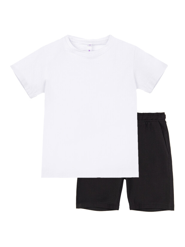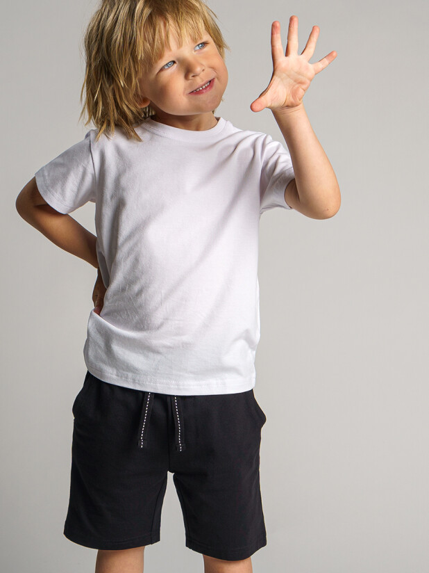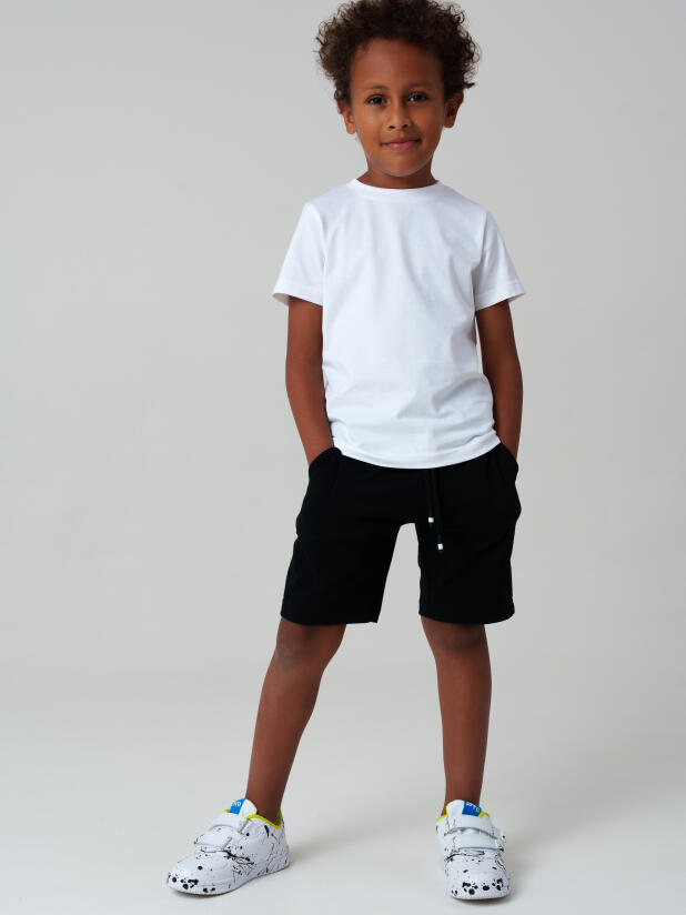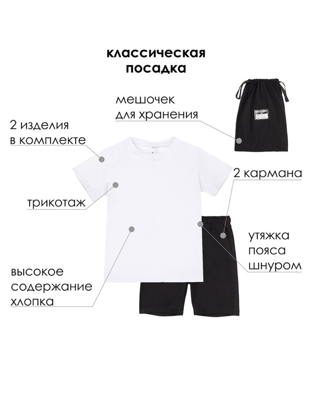 Базовая белая футболка для подростков имеет классический прямой крой — она легко комбинируется с другой школьной одеждой. Универсальные черные шорты с широкой резинкой и дополнительным шнурком обеспечивают плотную, но комфортную посадку, а практичные карманы делают спортивный детский костюм для школы функциональным и удобным для активного дня.