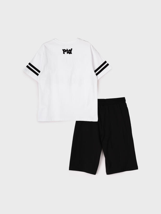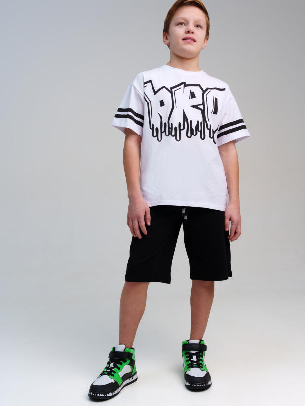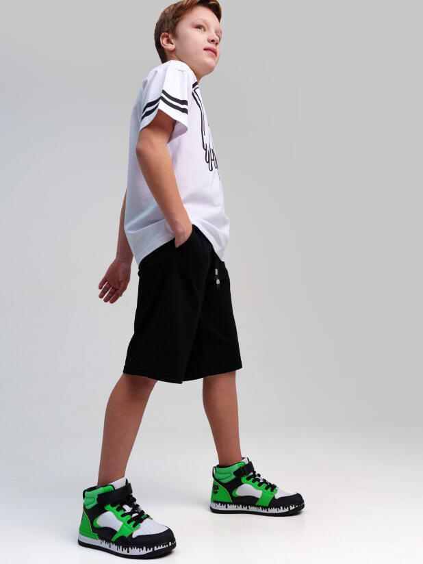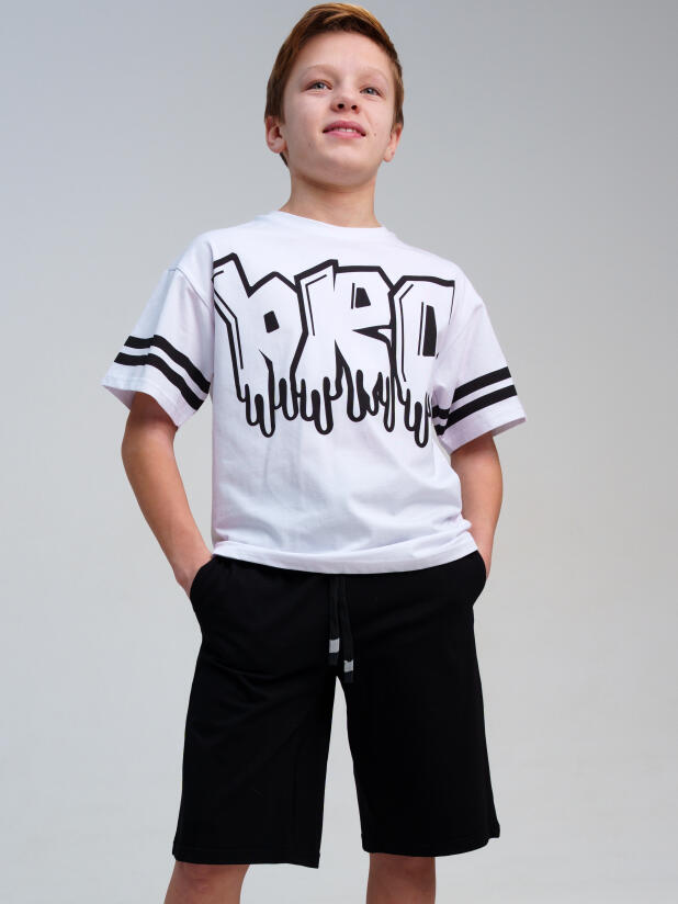 Костюм для мальчика подростка: футболка и шорты. Шорты на резинке со шнурком. Функциональные боковые карманы. Высокое содержание хлопка 95%. Благодаря наличию эластана в составе ткани изделие держит форму и меньше мнется. Модель выполнена из качественного и приятного на ощупь трикотажа.