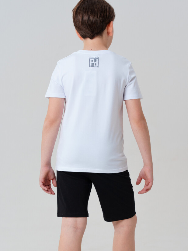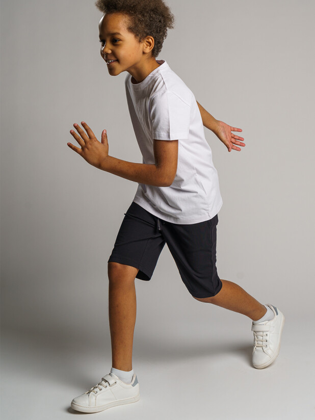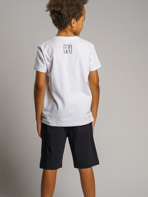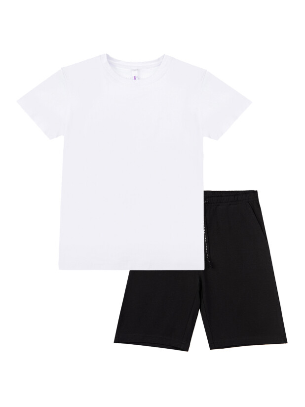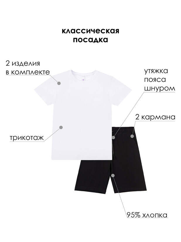 Такая детская физкультурная форма для мальчиков станет удобной основой гардероба школьника. Базовые черные шорты для спорта комфортно сидят на талии, а универсальная белая футболка для подростков подходит как для активных движений, так и для повседневных задач. Удобная и компактная сумка мешок помогает носить комплект с собой и хранить всё в порядке.