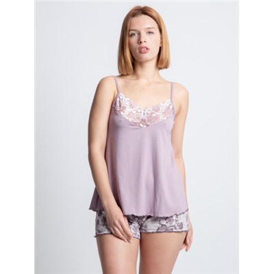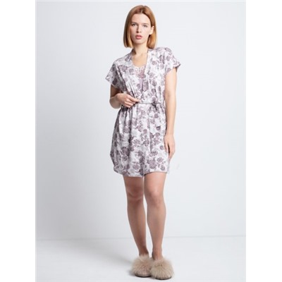 Производитель: Lilians Оптовая продажа. Комплект домашний: Халат, топ и шорты. Халат с коротким рукавом на запахе, топ с широкой кружевной вставкой по декольте, тонкие бретели. Шорты принтованные. Состав: Вискоза: 95% Эластан: 5%
