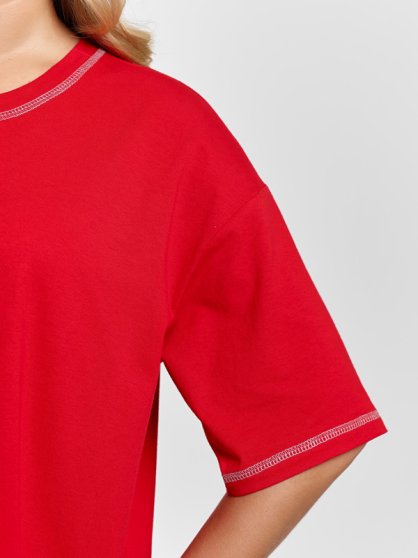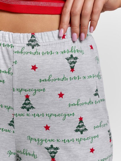 Оптовая продажа. Костюм женский из трикотажного полотна "кулирка" в комбинации двух видов: гладкокрашенного красного цвета и с набивным тематическим рисунком на сером фоне , состоящий из футболки и брюк. Футболка - модного силуэта, слегка укороченная свободного покроя, с приспущенным плечом, с втачными рукавами длиной до локтя, горловиной овальной формы, обработанной втачной планкой и принтом в центре переда. Брюки выполнены из полотна с набивным темкатическим рисунком, длинные, умеренной ширины, прямые, с эластичной тесьмой по талии.
