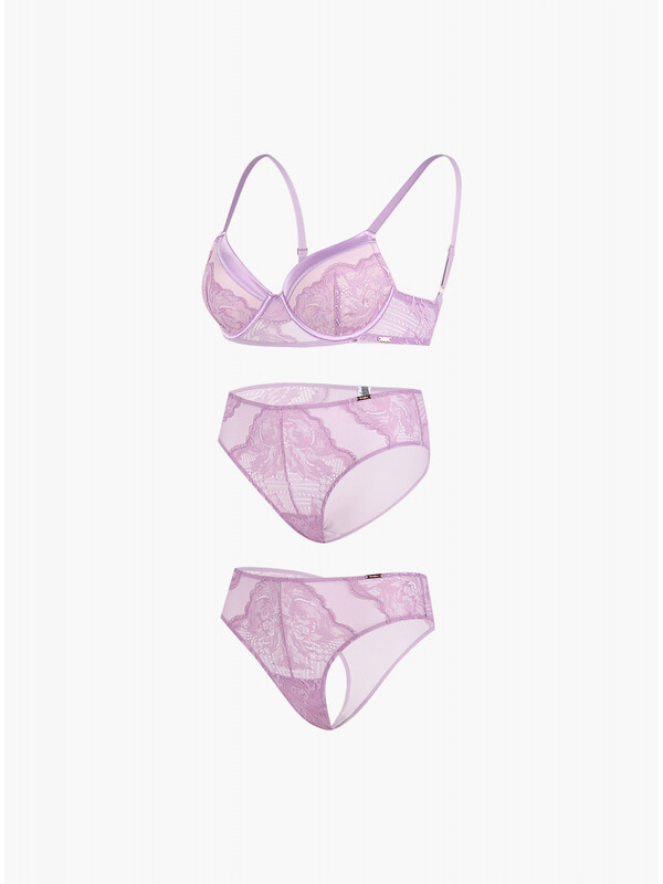 Комплект нижнего белья от торговой марки Индефини. В комплекте бюстгальтер и трусики. Бюстгальтер из полиамида, сиреневого цвета, на косточках, с формованными чашками, с кружевными вставками и обрамлением, с атласными вставками, на кружевном поясе, на тонких лямках, на застежках, лямки регулируются. Трусы, слипы и стринги, из полиамида, сиреневого цвета, из кружевной ткани, со вставками и обрамлением, на мягкой резинке, средней посадки.