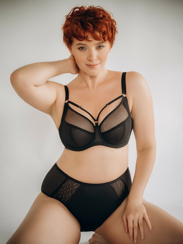 Комплект нижнего белья состоит из бюстгальтера и трусов-слипов. Бюстгальтер на тонких регулируемых бретелях имеет застёжки на крючках сзади. Поролоновые чашки на косточках выполнены без дополнительной поддержки груди. По бокам и между чашками спереди имеются сетчатые вставки. Трусы слипы высокой посадки имеют мягкую эластичную резинку на талии и сетчатые вставки спереди. На внутренней стороне трусов расположена хлопковая ластовица.