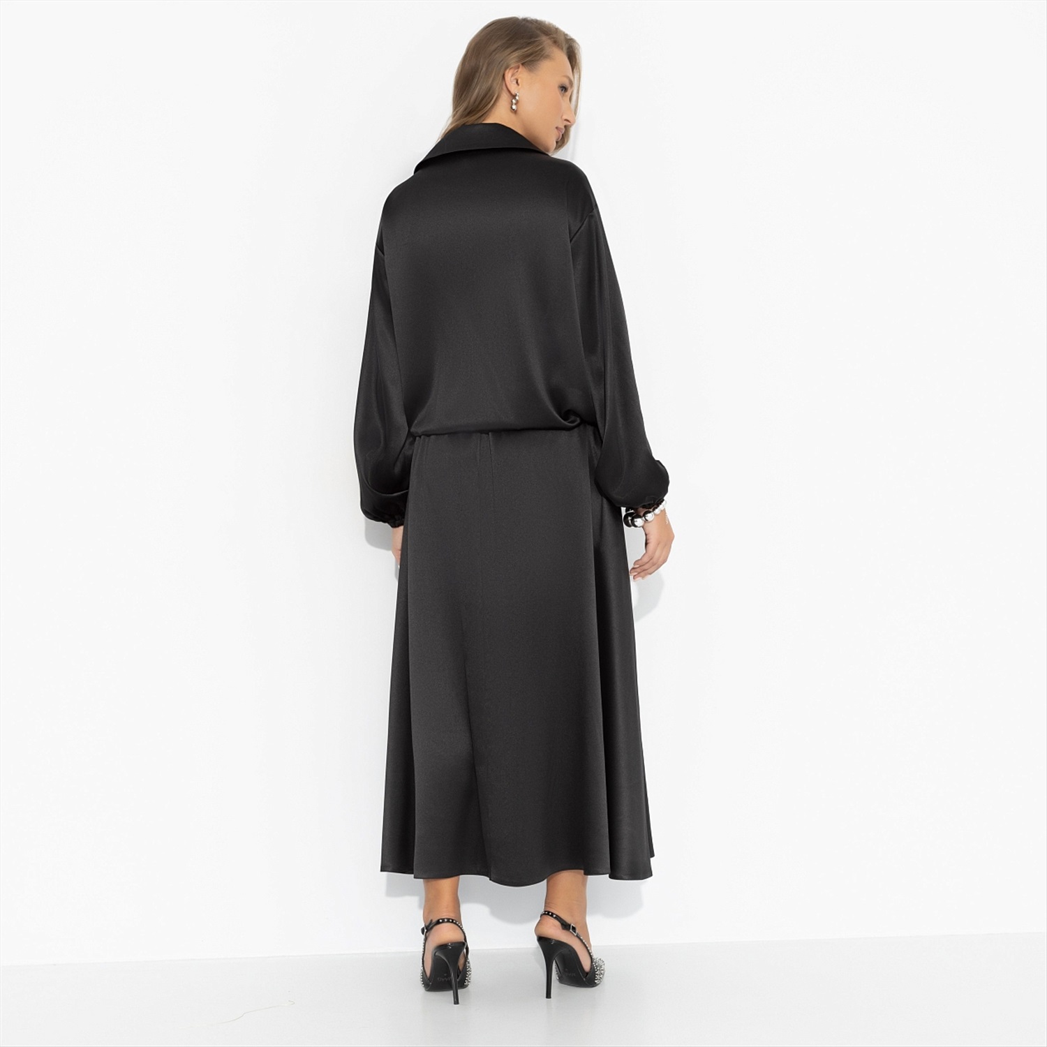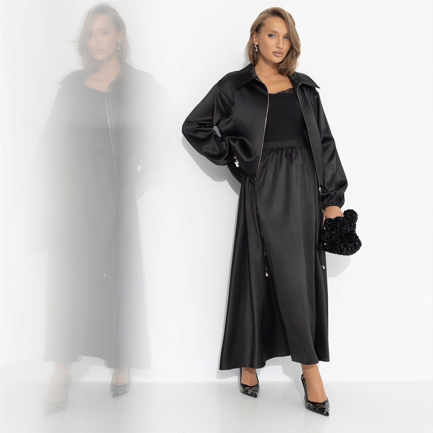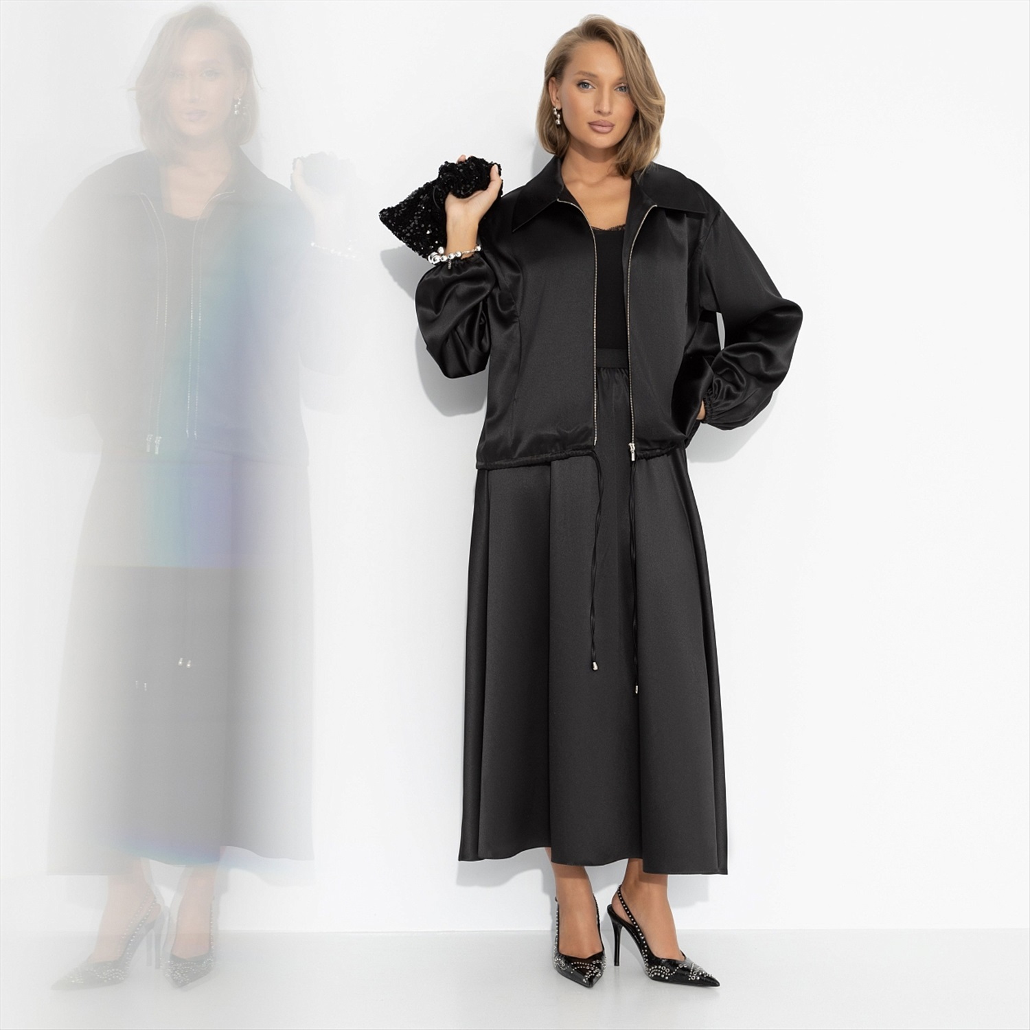 Поздний вечер, огни витрин мелькают в окне такси, и город кажется немного волшебным. Свободный бомбер на молнии, с кулиской по низу, и эффектная юбка с поясом-резинкой образуют стильный дуэт. Черный атлас красиво струится при движении. Носи вместе – или по отдельности, создавая каждый раз новую историю о себе. Комплект из бомбера и юбки. Оба изделия с карманами.