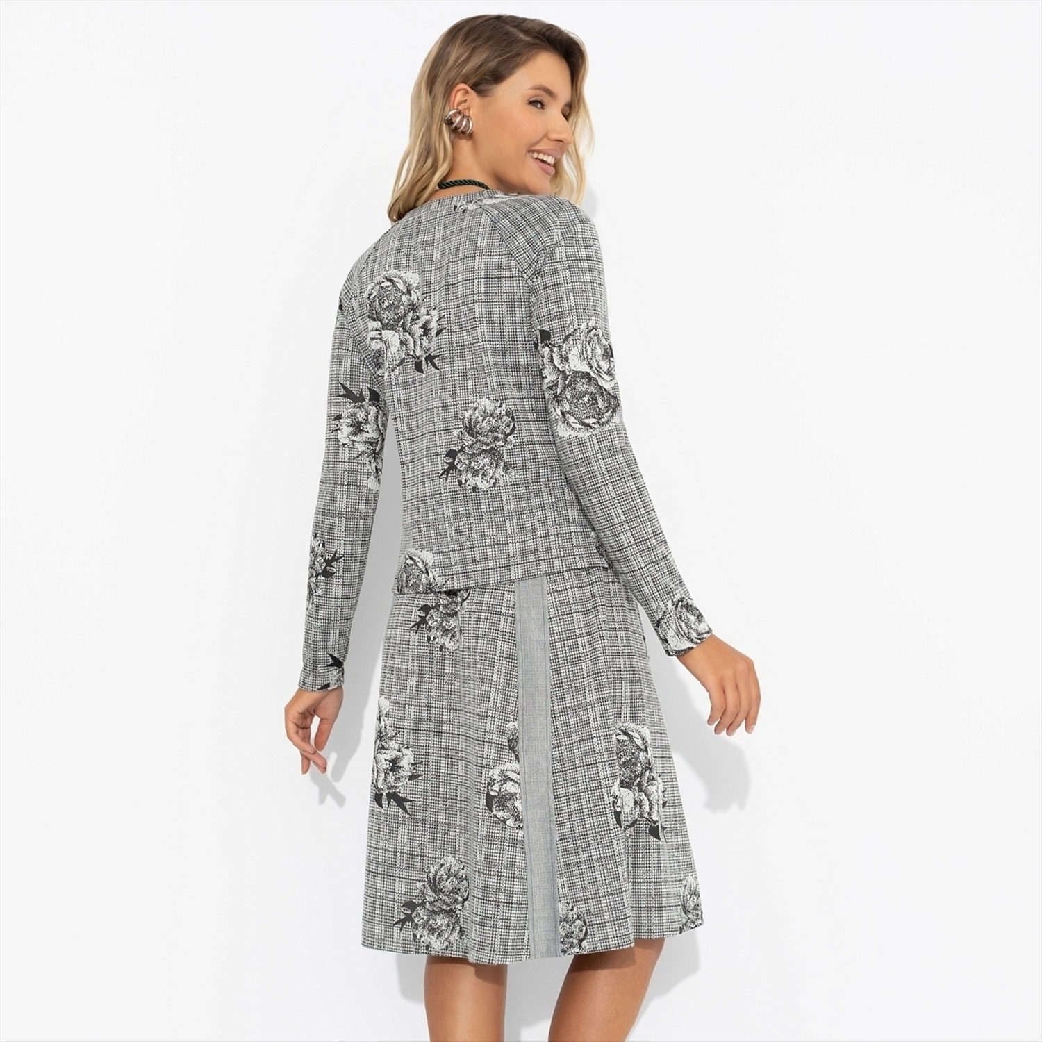 ТН ВЭД: 6104230000; Состав: Трикотаж «жаккард» (65% п/э, 30% вискоза, 5% спандекс); Плотность ткани: Плотная; Тип ткани: Трикотаж; Вид застежки: Нет; Декоративные элементы: Контрастная отделка; Дополнительный цвет ткани: Черный; Карманы: Нет; Основной цвет ткани: Серый; Отрезная талия: Нет; Подклад: Нет; Резинка по талии: Есть; Рисунок/раппорт: Нет, все изделия идентичны; Сезон: Зима; Силуэт: Приталенный; Стиль: Повседневный